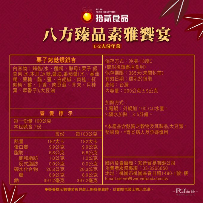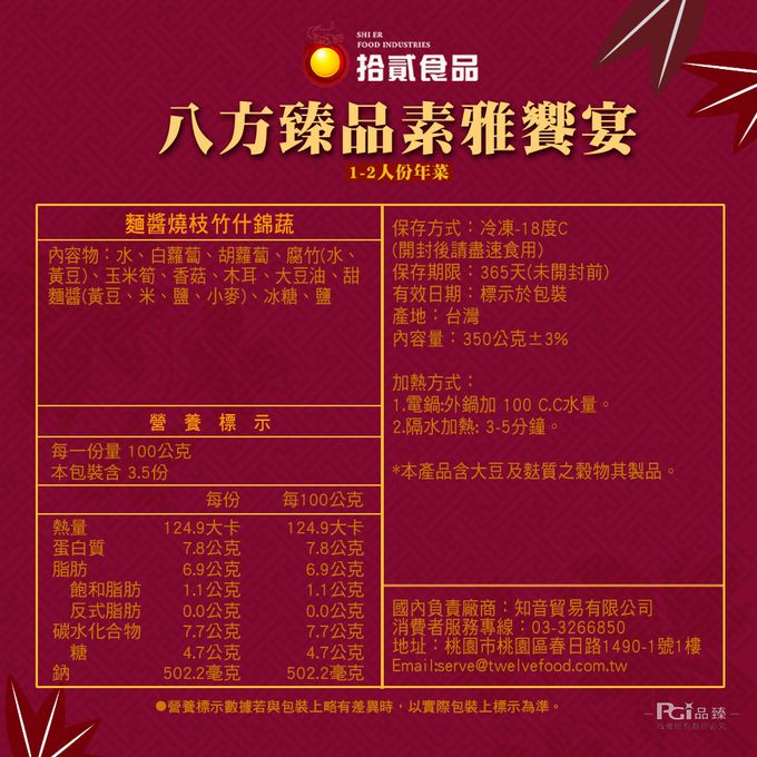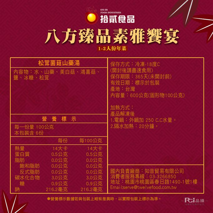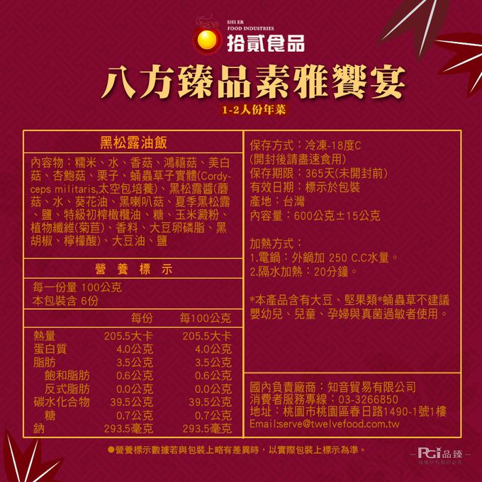 商品重(容)量:黑松露油飯:600g±15g 栗子烤麩煨銀杏:200g±9g 義式松露炒真菌:200g±9g 香菇牛蒡燒鳳果:250g±9g 麵醬燒枝竹什錦蔬:350g±3% 松茸菌菇山藥湯:600g(固形物100g) 欖菜四季豆:200g±9g 芋頭西米露:600g±15g(固形物110g±4.5%)