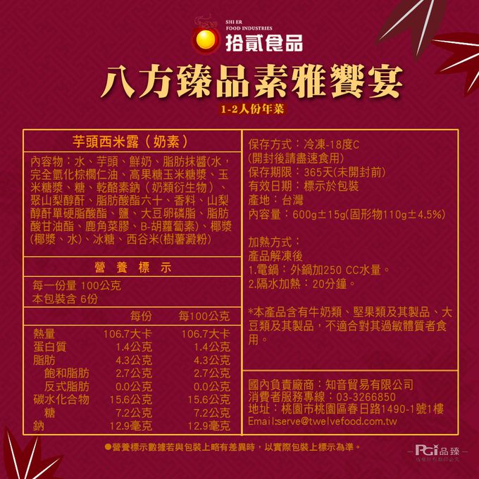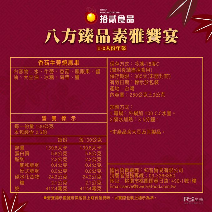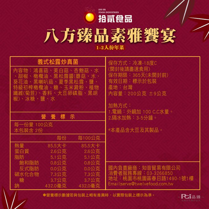 成分:黑松露油飯:糯米、水、香菇、鴻禧菇、美白菇、杏鮑菇、栗子、蛹蟲草子實體(Cordyceps miltaris,太空包培養)、松露醬(蘑菇、水、葵花油、黑喇叭菇、夏季黑松露、鹽、特級初榨橄欖油、糖、玉米澱粉、植物纖維(菊苣)、香料、大豆卵磷脂、黑胡椒、檸檬酸)、大豆沙拉油、鹽。 栗子烤麩煨銀杏:烤麩(水、麵粉、酵母)、栗子、銀杏果、水、木耳、冰糖、醬油、番茄醬(水、番茄糊、蔗糖、醋、鹽、白胡椒、肉桂、紅辣椒、薑、丁香、肉豆蔻、芥末、月桂葉、眾香子)、大豆沙拉油。 義式松露炒真菌:鴻喜菇、美白菇、杏鲍菇、水、甜椒、橄欖油、黑松露醬(蘑菇、水、葵花油、黑喇叭菇、夏季黑松露、鹽、特級初榨橄欖油、糖、玉米澱粉、植物纖維(菊苣)、香料、大豆卵磷脂、黑胡椒)、冰糖、鹽、水。 香菇牛蒡燒鳳果:水、牛蒡、香菇、鳳眼果、醬油、大豆油、冰糖、海帶、鹽。 麵醬燒枝竹什錦蔬:水、白蘿蔔、胡蘿蔔、腐竹(水、黄豆)、玉米筍、香菇、木耳、橄欖油、甜麵醬(黃豆、米、鹽、小麥)、冰糖、鹽。 松茸菌菇山藥湯:水、山藥、美白菇、鴻喜菇、冰糖、松茸。 欖菜四季豆:敏豆莢、橄欖菜(芥菜、橄欖、芝麻、菜籽油、食鹽)、紅辣椒、冰糖、味精。 芋頭西米露:水、芋頭、鮮奶、鮮奶油(水、氫化棕櫚油、玉米糖漿、糖、乾酪素鈉、鹽、大豆卵磷脂)、椰漿(椰漿、水)、冰糖、西谷米。