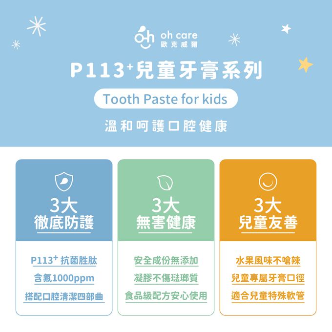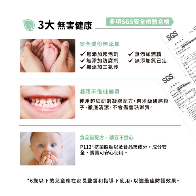 使用方式:每日2-3次,取適量擠在牙刷上,刷牙後以清水漱口。亦可擠至拭口布擦拭口腔,幫助維持口腔清潔