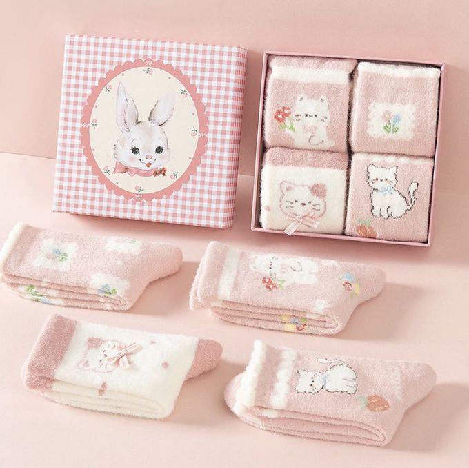 粉白喵咪小花雲朵絨保暖中筒襪 (均碼 (腳長20cm~25cm))-4 雙一組盒裝