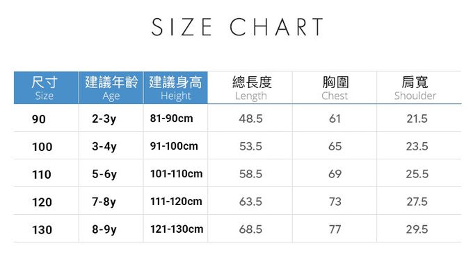 1. 尺寸表單位皆為公分(cm),實際尺寸會因布料彈性、水洗、測量起訖點等因素略有誤差。