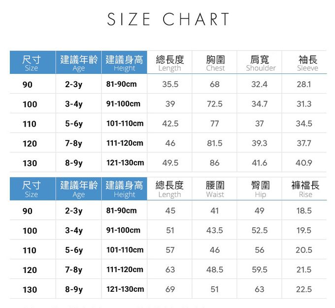 1. 尺寸表單位皆為公分(cm),實際尺寸會因布料彈性、水洗、測量起訖點等因素略有誤差。