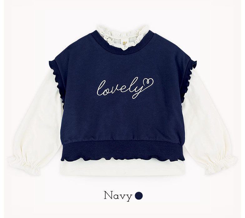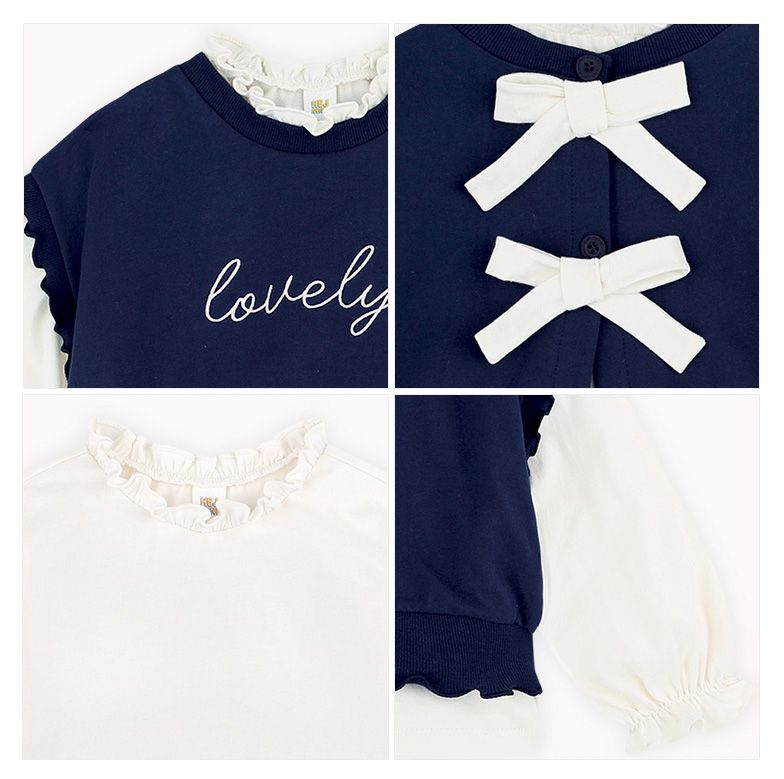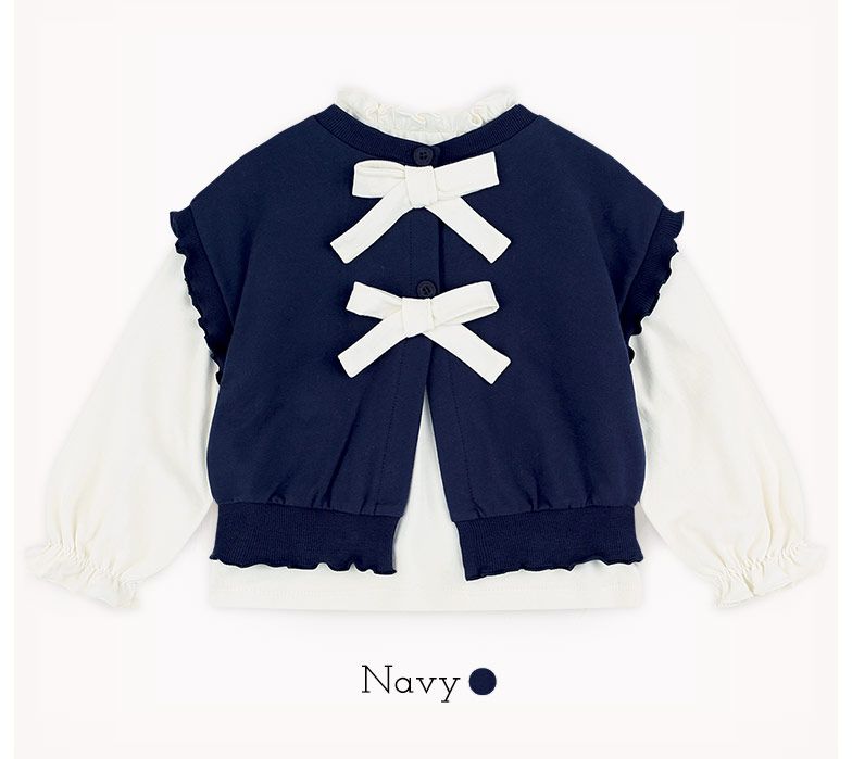 韓國 HEJMINI - 兩件式Lovely蝴蝶結綁帶長袖背心上衣-海軍藍X白