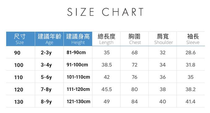 1. 尺寸表單位皆為公分(cm),實際尺寸會因布料彈性、水洗、測量起訖點等因素略有誤差。