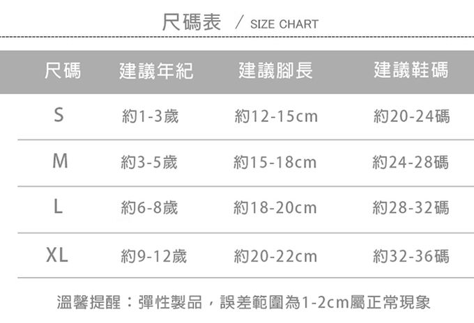 M(建議腳長15-18cm)、L(建議腳長(18-20cm)、XL(建議腳長(20-22cm)