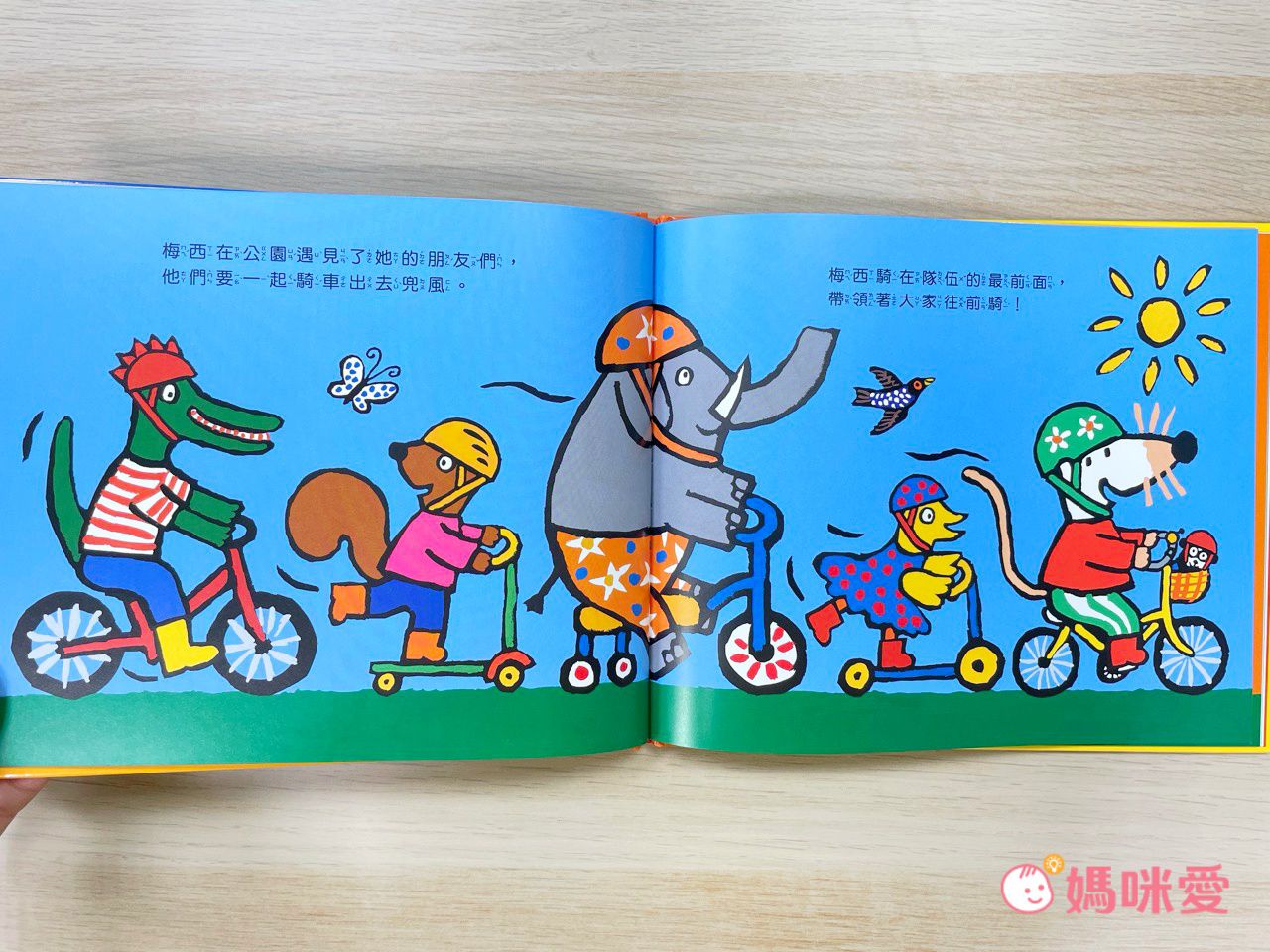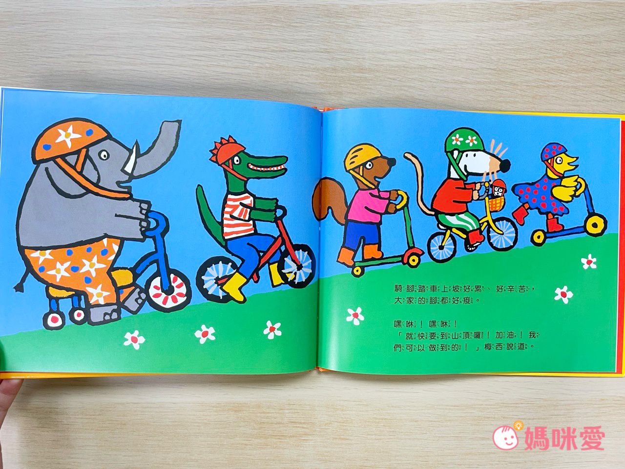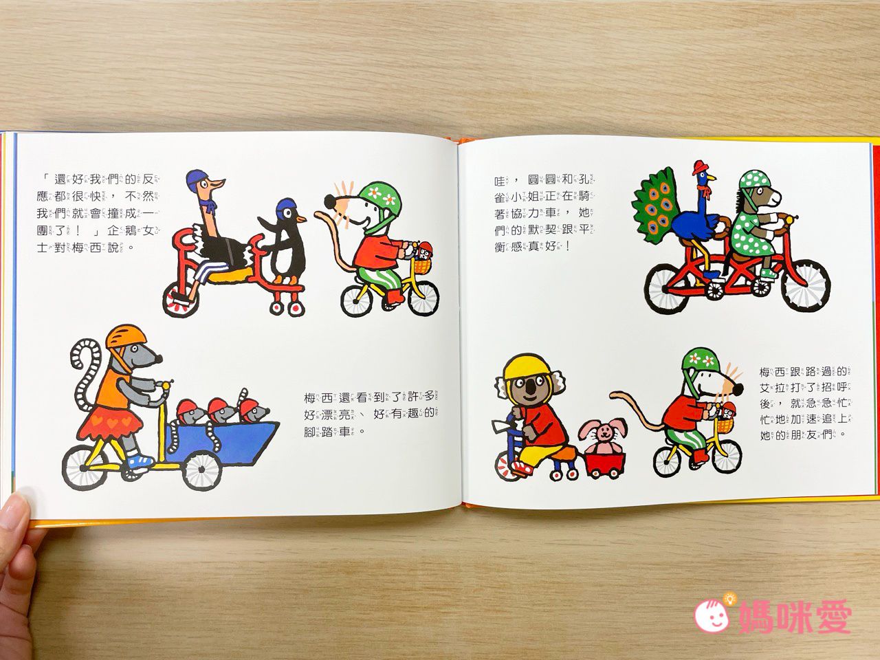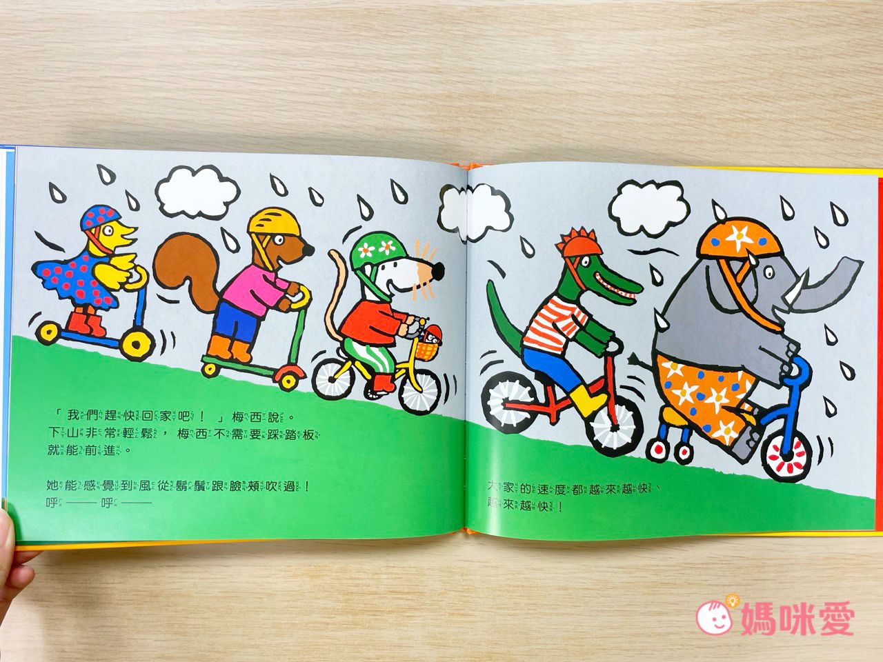 編媽很喜歡讓孩子看這種內容看似簡單,寓意卻很深的繪本!像這本書裡說到梅西喜歡和朋友一起玩,即便她一開始騎腳踏車會搖搖晃晃,但仍然鼓起勇氣騎到公園跟朋友們玩。孩子能隨著情節和梅西一起體驗從第一次騎腳踏車,到努力騎上山坡,並在雨天匆忙回家的美好旅程,享受一同成長與揮灑汗水~!!