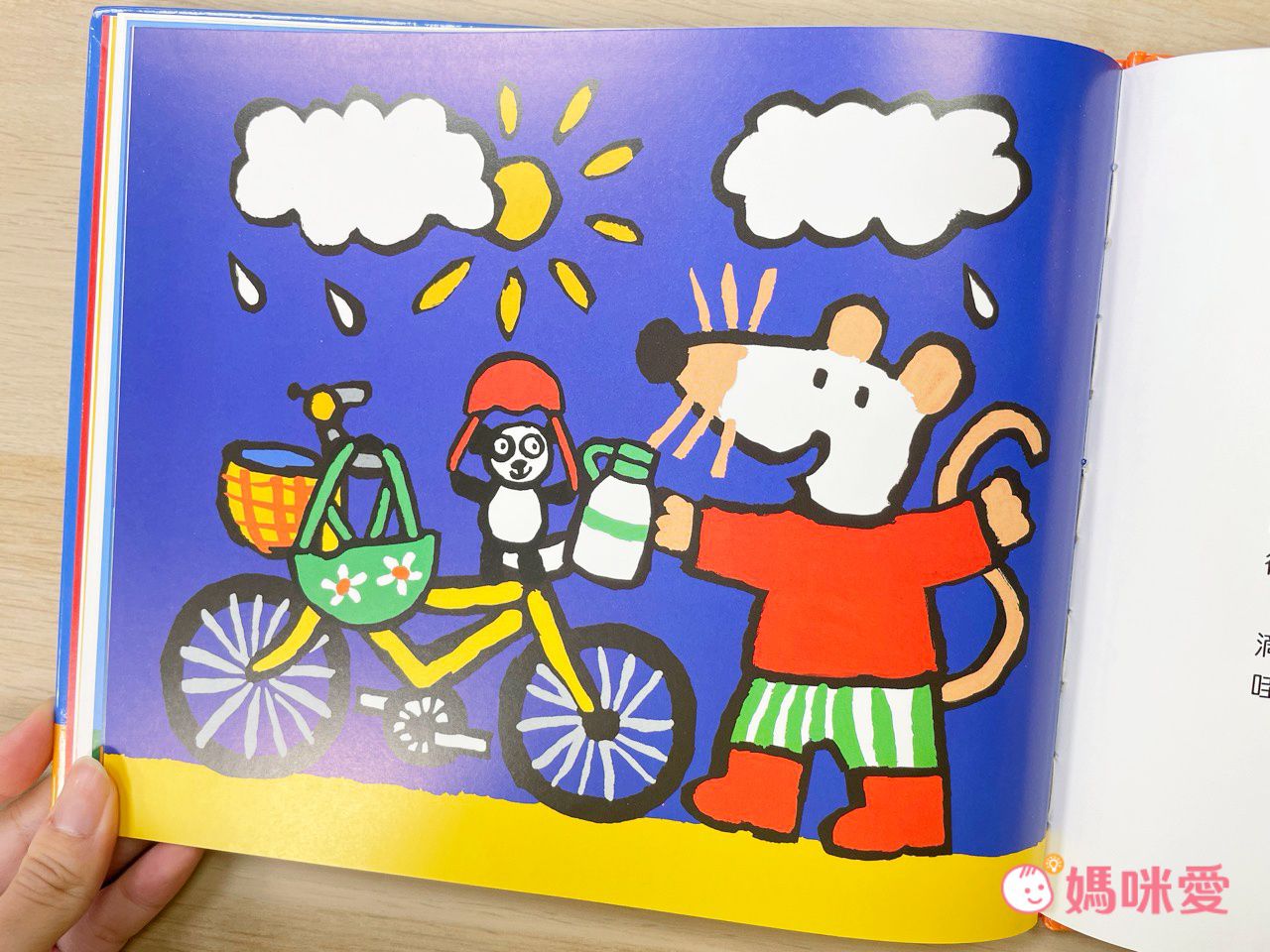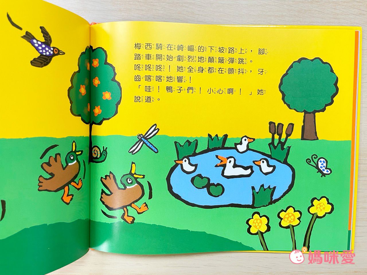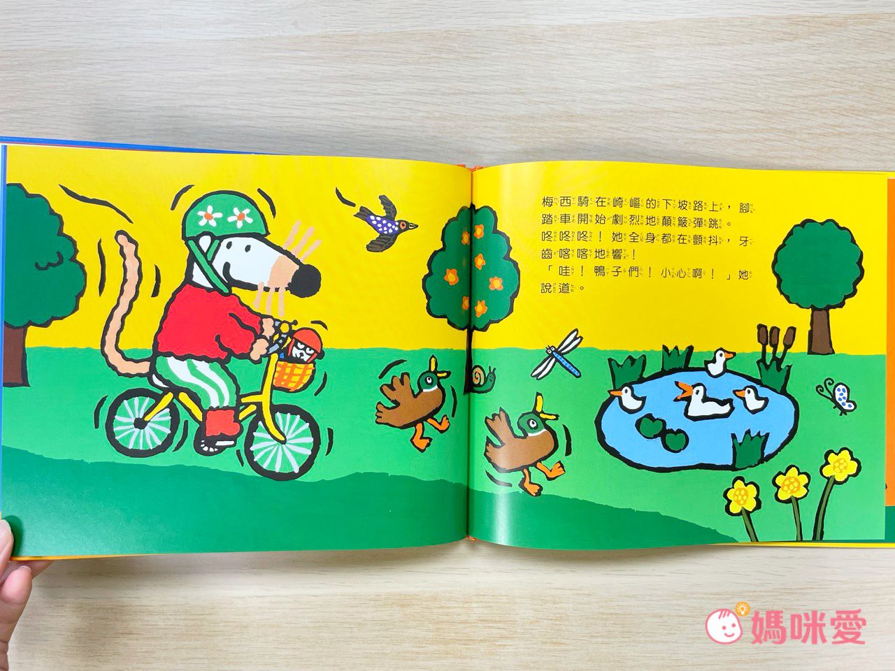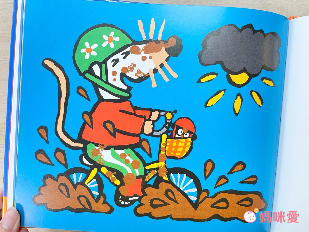 編媽很喜歡讓孩子看這種內容看似簡單,寓意卻很深的繪本!像這本書裡說到梅西喜歡和朋友一起玩,即便她一開始騎腳踏車會搖搖晃晃,但仍然鼓起勇氣騎到公園跟朋友們玩。孩子能隨著情節和梅西一起體驗從第一次騎腳踏車,到努力騎上山坡,並在雨天匆忙回家的美好旅程,享受一同成長與揮灑汗水~!!