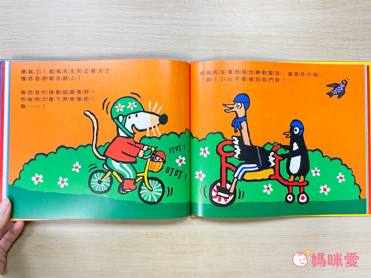結果下一秒遇上鴕鳥先生跟企鵝女士慢悠悠的騎在路上!梅西急忙撥動腳踏車鈴,然後用力壓下煞車握把。