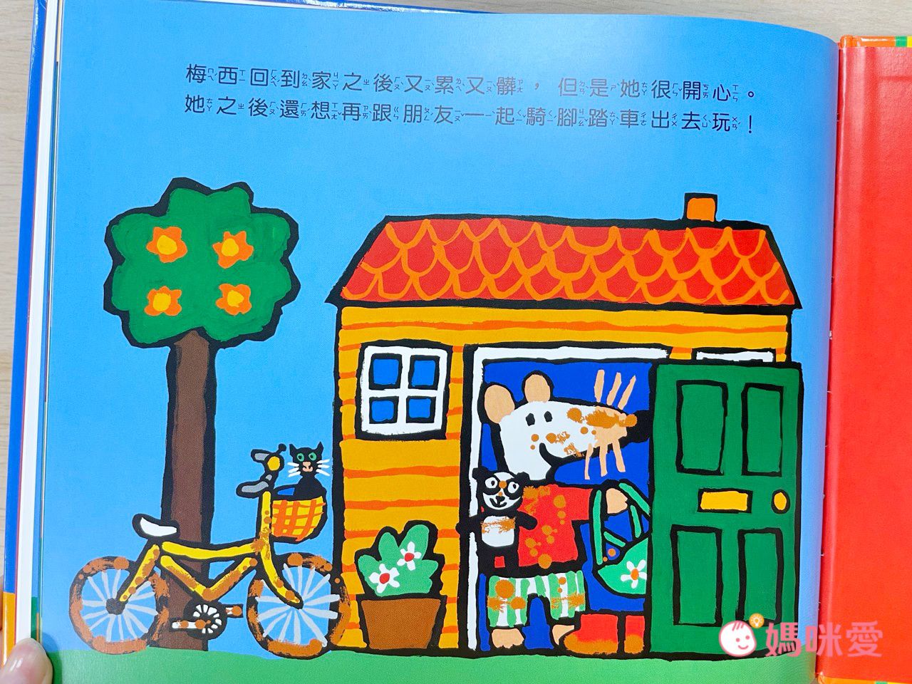 梅西回到家之後又累又髒,但是她很開心。她之後還想跟朋友一起騎腳踏車出去玩!這趟騎行旅程實在美好~真是充滿樂趣的繪本,推薦給大家❣️
