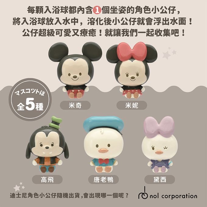 每顆入浴球都內含1個坐姿的角色小公仔,共5種,採隨機出貨!