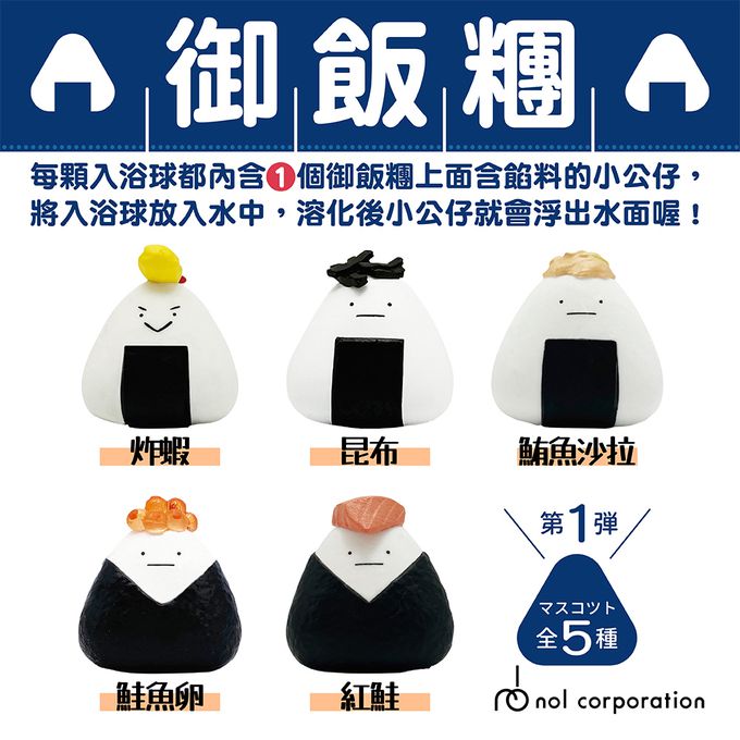 御飯糰造型入浴劑,每顆入浴球都內含1個御飯糰上面含餡料的小公仔,共5種,採隨機出貨!