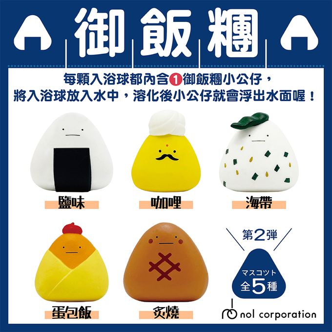 御飯糰造型入浴劑,每顆入浴球都內含1個御飯糰上面含餡料的小公仔,共5種,採隨機出貨!