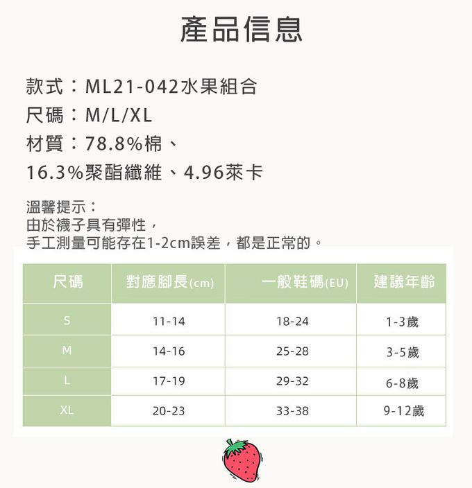 M (建議腳長14-16cm)、L (建議腳長17-19cm)、XL (建議腳長20-23cm)