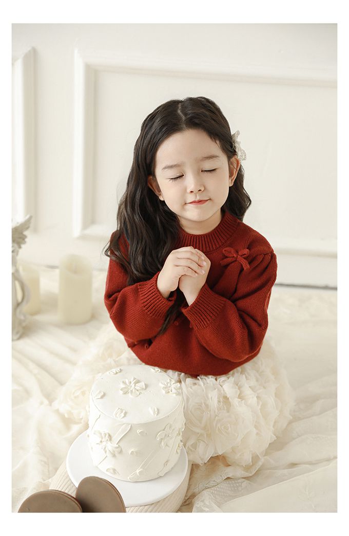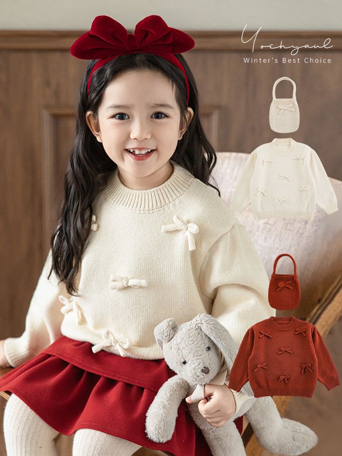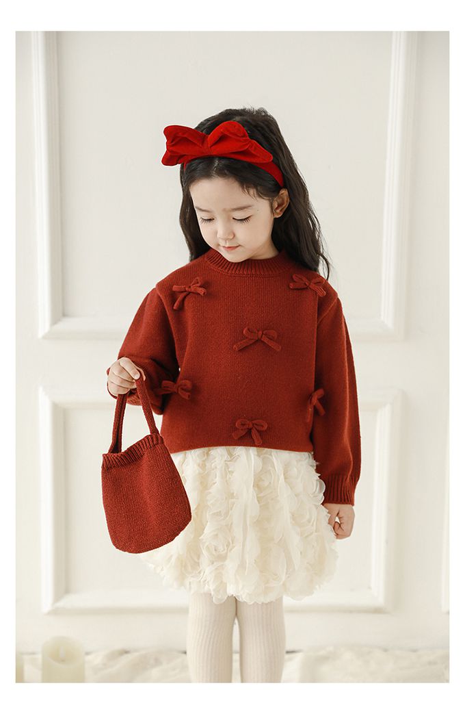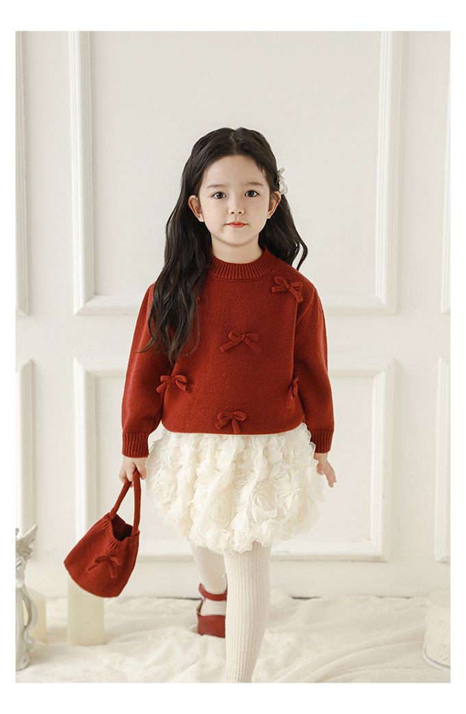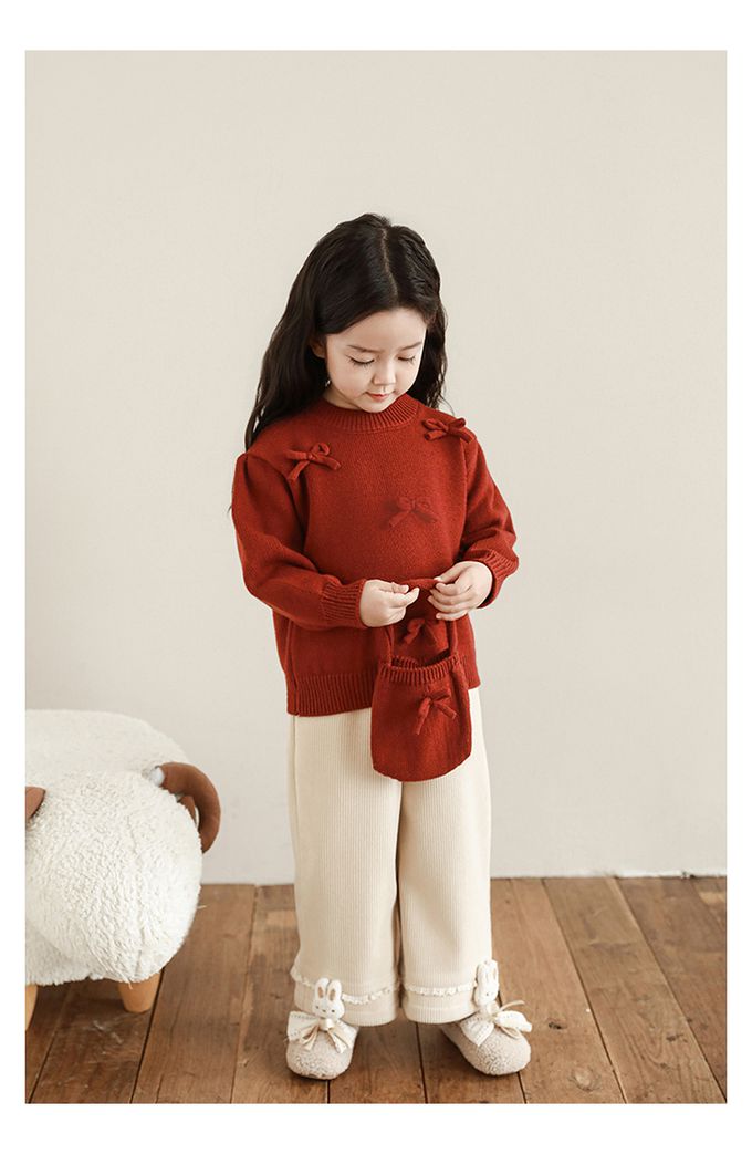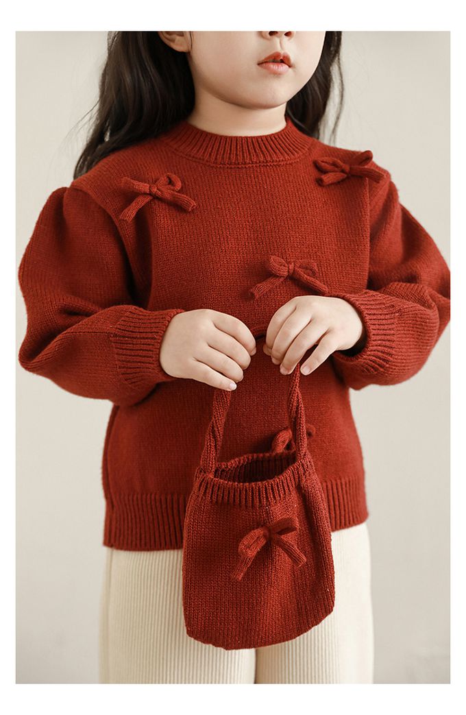 抗起球圓領針織長袖上衣(贈小包)-手縫立體蝴蝶結-紅色