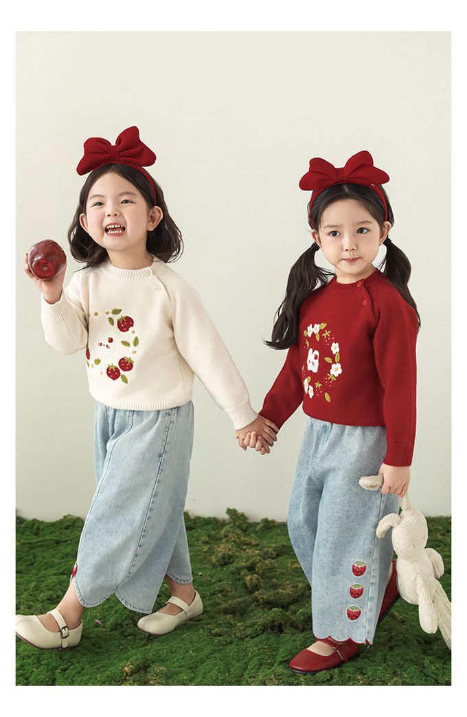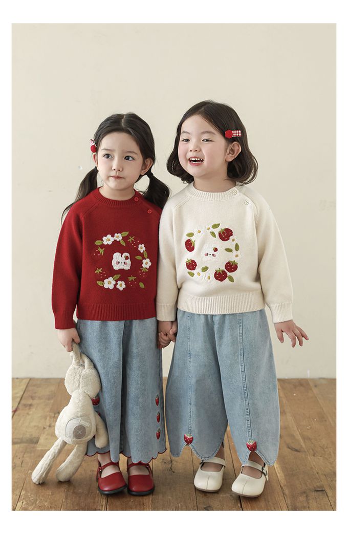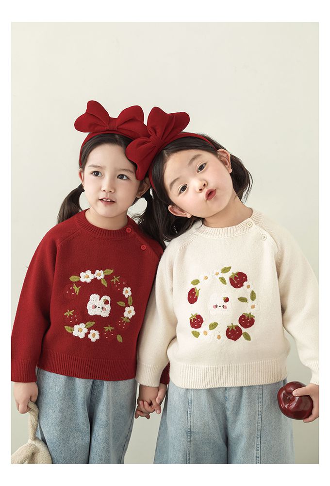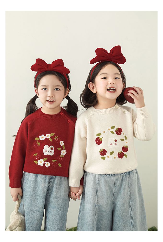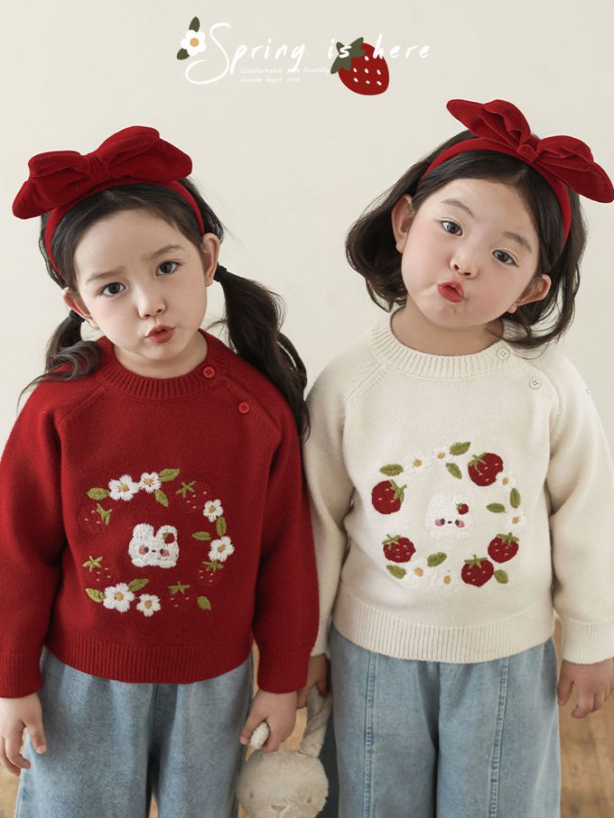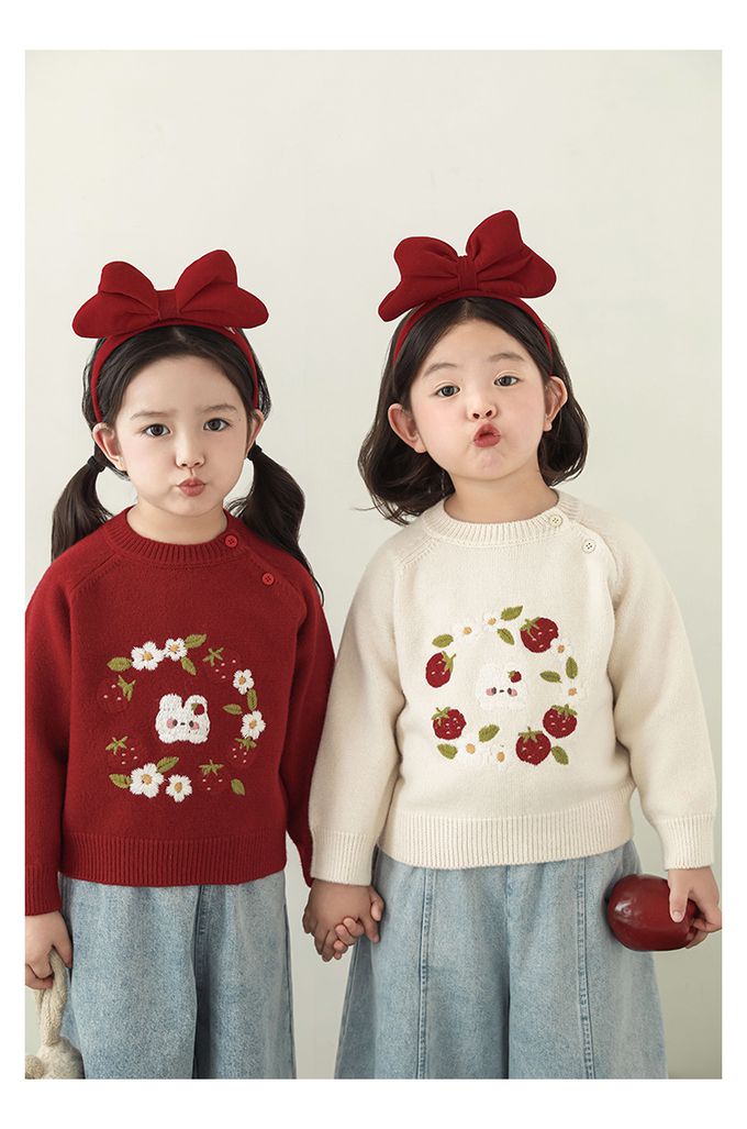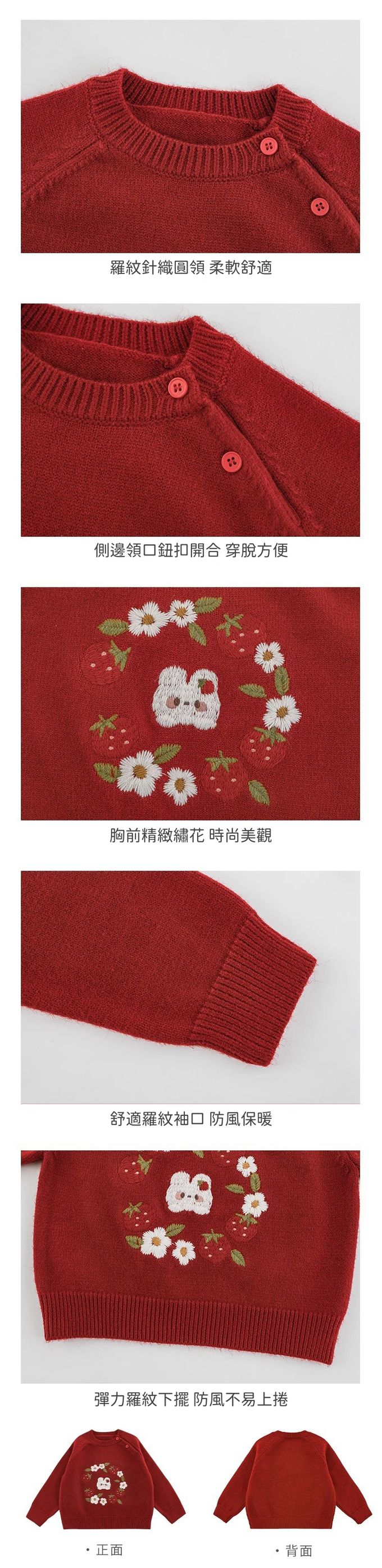 抗起球肩扣針織長袖上衣-萌兔編織草莓花環-紅色