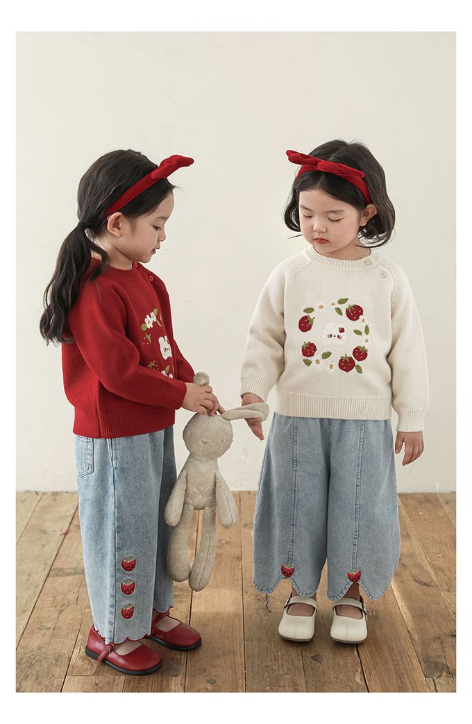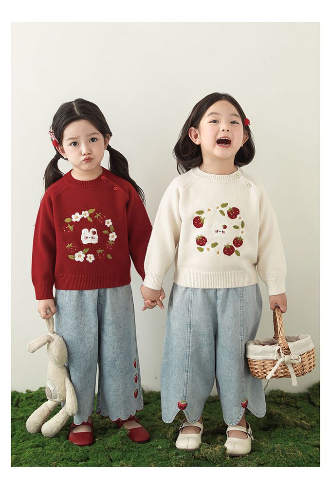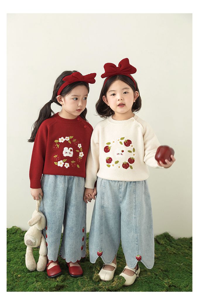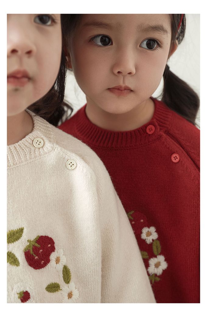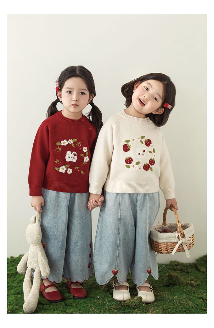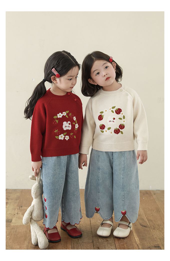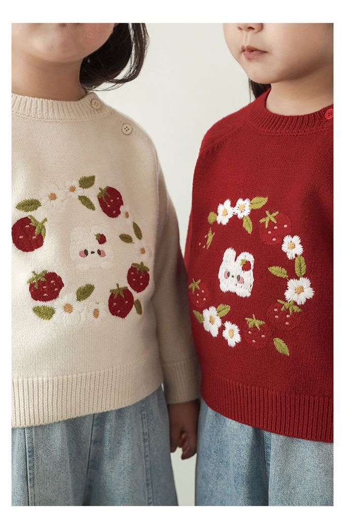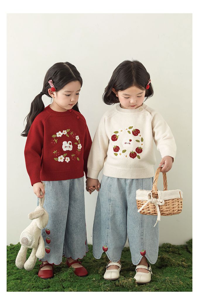 抗起球肩扣針織長袖上衣-萌兔編織草莓花環-紅色