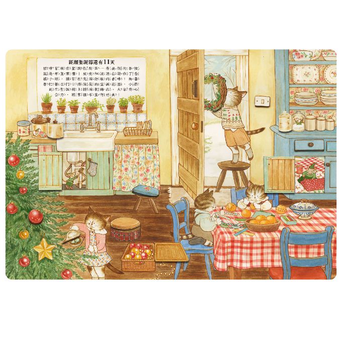 本書故事梗概是聖誕節前12天,貓咪家族開始為聖誕節做準備,他們做百果甜派、在壁爐前掛襪子等,最後圍坐在客廳聽聖誕故事!在閱讀中讓孩子認識英國會做哪些準備迎接聖誕節、聖誕節習俗,體驗濃濃的節慶氣息。除此之外這不只是翻翻書,也是一本適合細細品味、反覆翻閱的繪本,跟著貓咪家族的腳步,感受溫馨的生活氛圍!