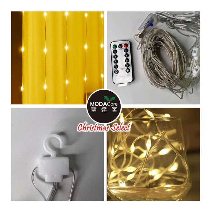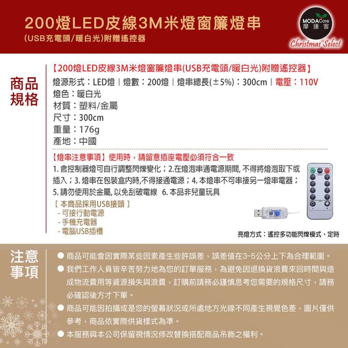 品名:200燈LED皮線3M米燈窗簾燈串(USB充電頭/暖白光)附贈遙控器