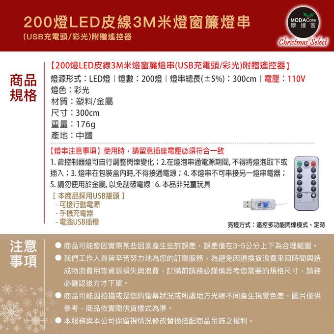 品名:200燈LED皮線3M米燈窗簾燈串(USB充電頭/彩光)附贈遙控器