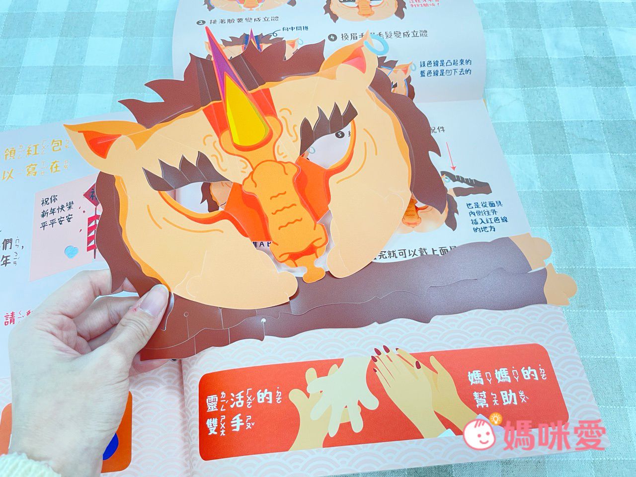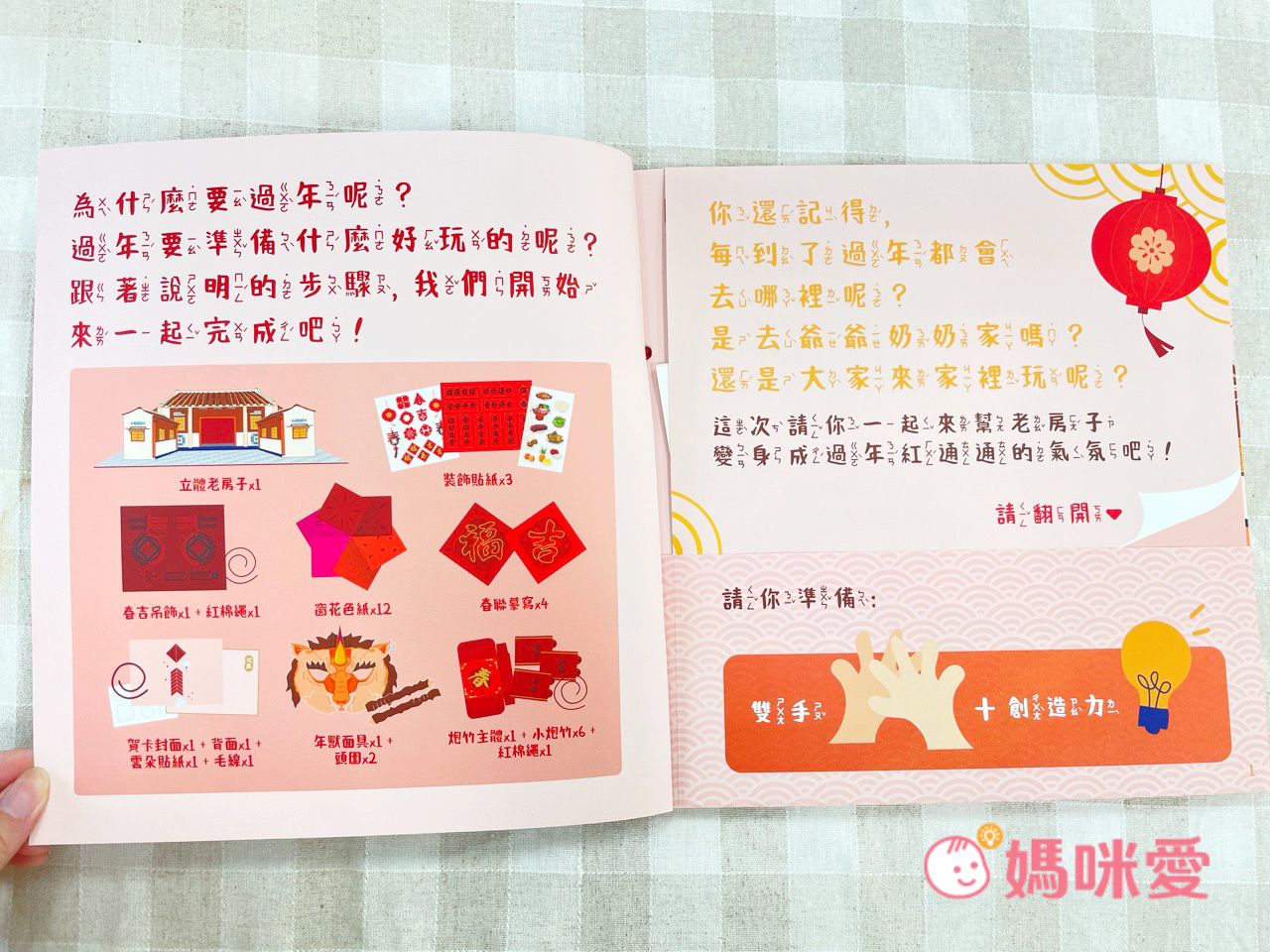 這裡頭的配件超可愛有:立體老房子、裝飾貼紙(春聯、年菜)、窗花色紙、春聯摹寫、賀卡、年獸面具、小炮竹等素材。