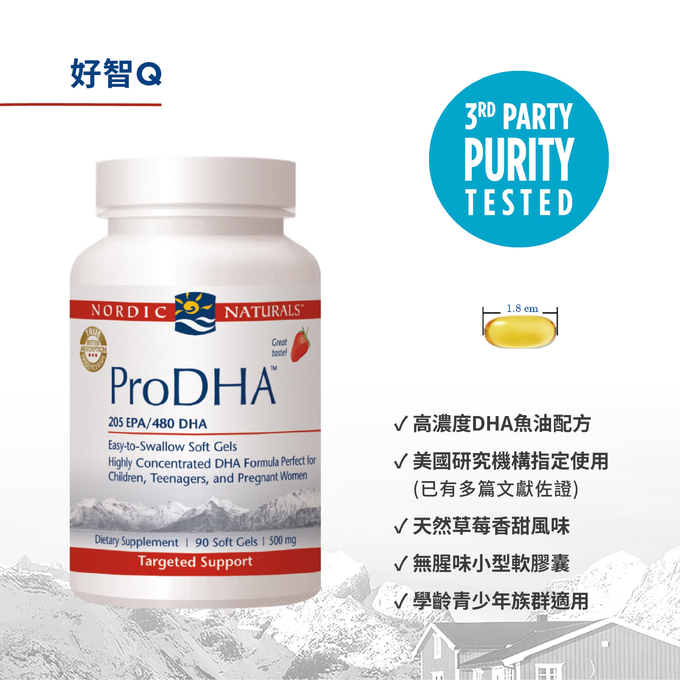 高DHA濃縮魚油配方,可調節生理機能。每份含有480毫克的DHA與205毫克的EPA,在美國獲多項研究機構選為臨床研究使用配方。專利製程,品質更高,無使用任何化學成分來萃取魚油。500毫克亦吞食小膠囊,天然草莓風味。
