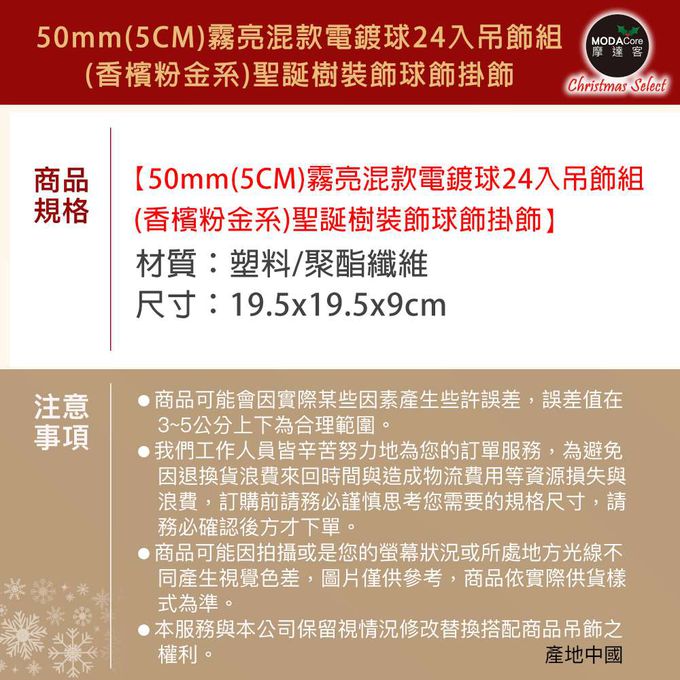 品名:耶誕-50mm(5CM)霧亮混款電鍍球24入吊飾組(香檳粉金系) 聖誕樹裝飾球飾掛飾