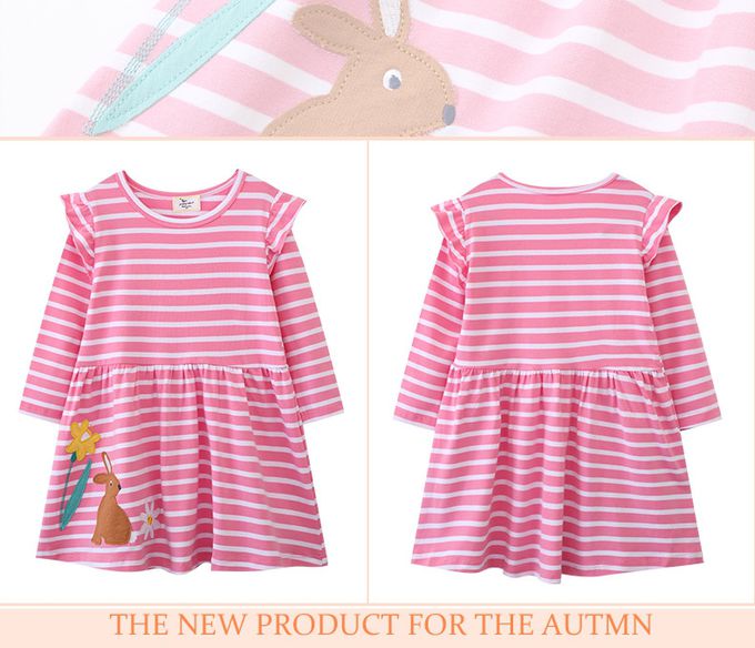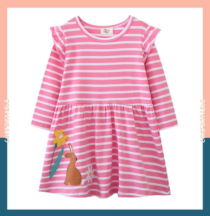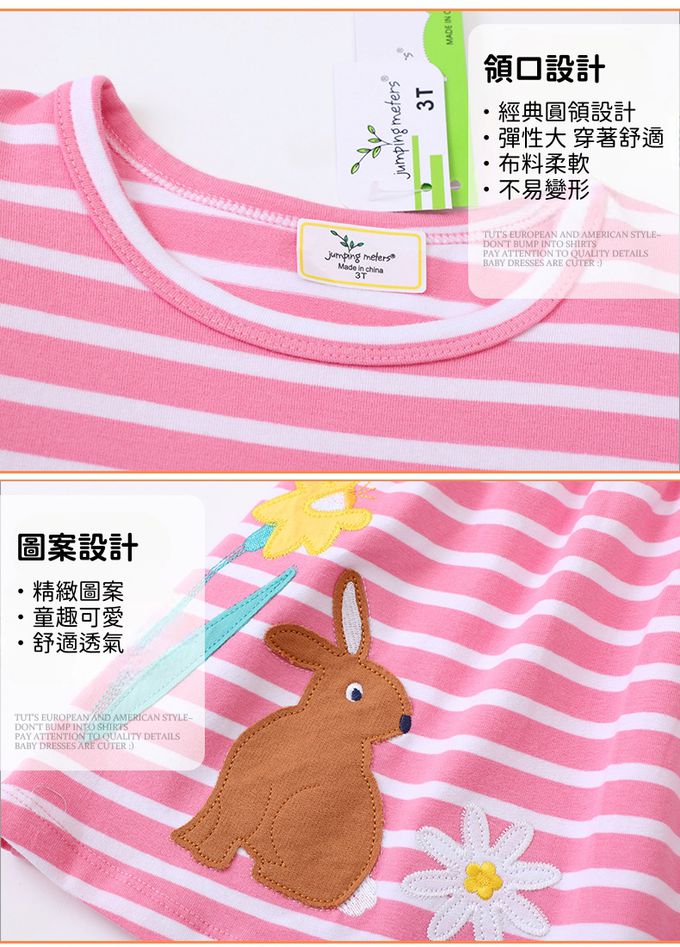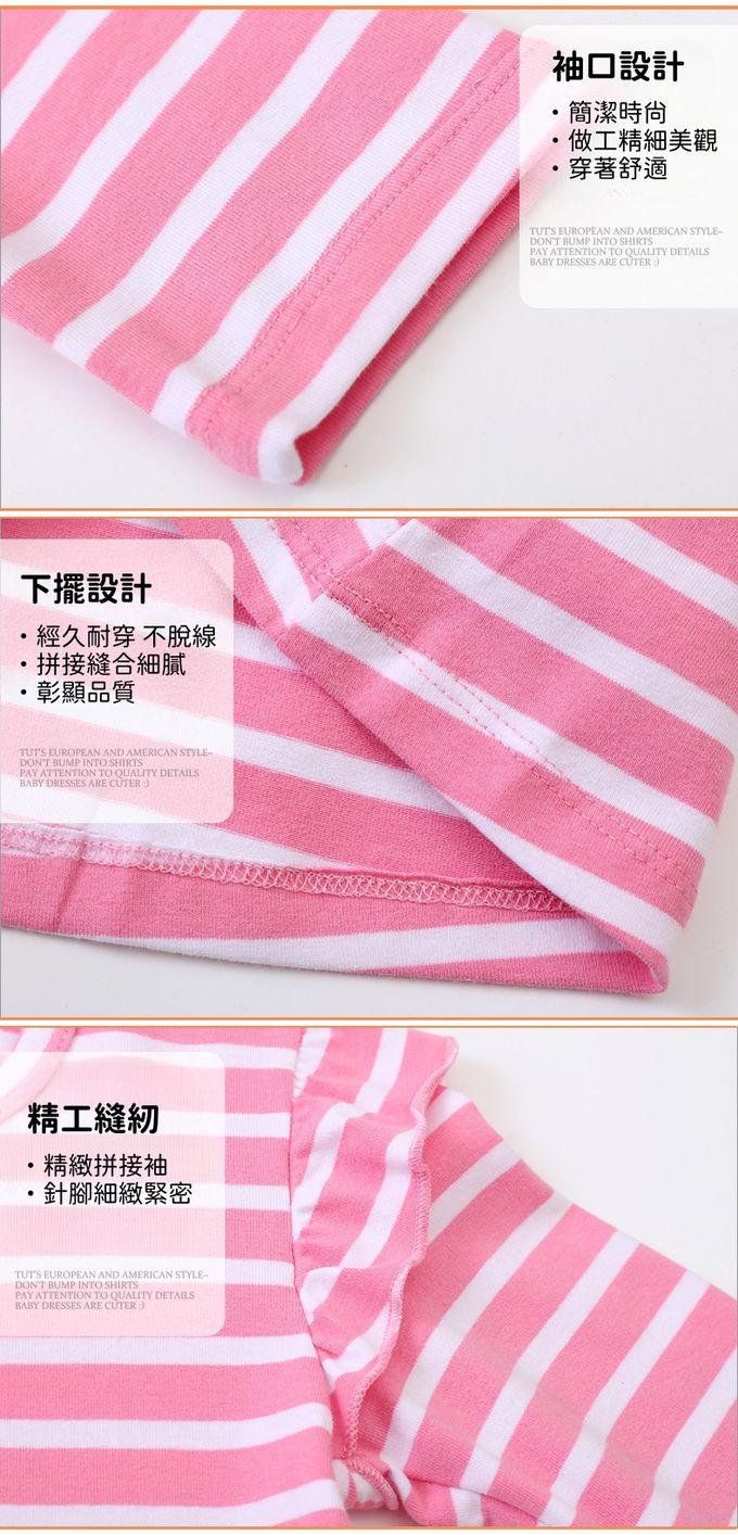 棉質圓領荷葉邊長袖連身洋裝-花朵兔兔-粉色條紋