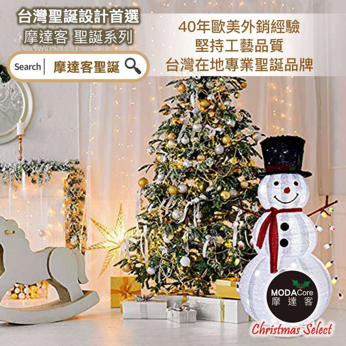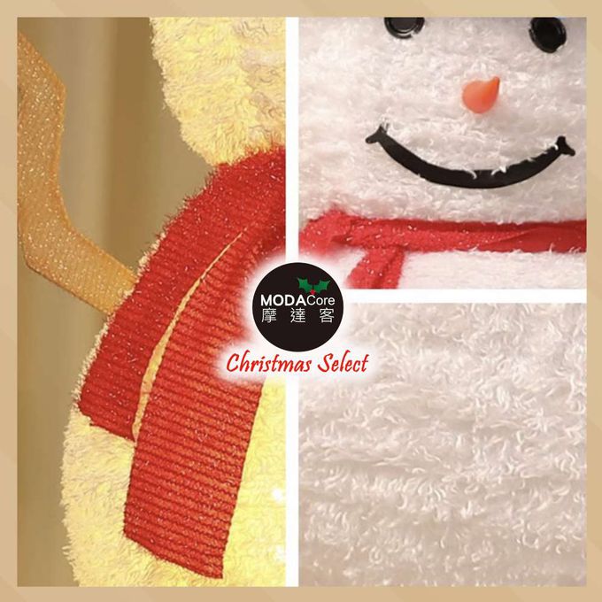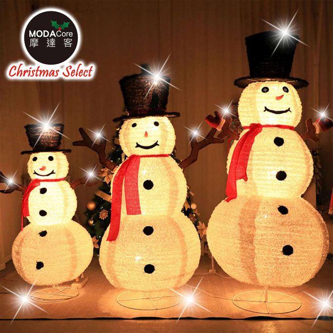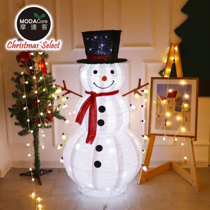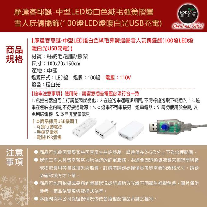 品名:摩達客聖誕-中型LED燈白色絨毛彈簧摺疊雪人玩偶擺飾(100燈LED燈暖白光USB充電)