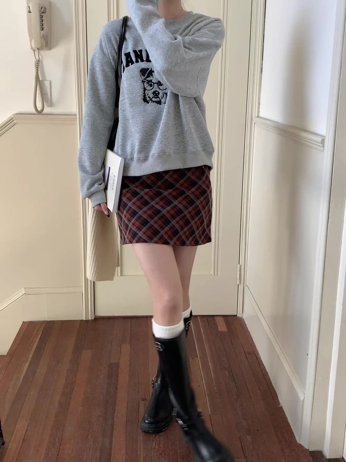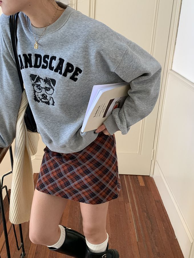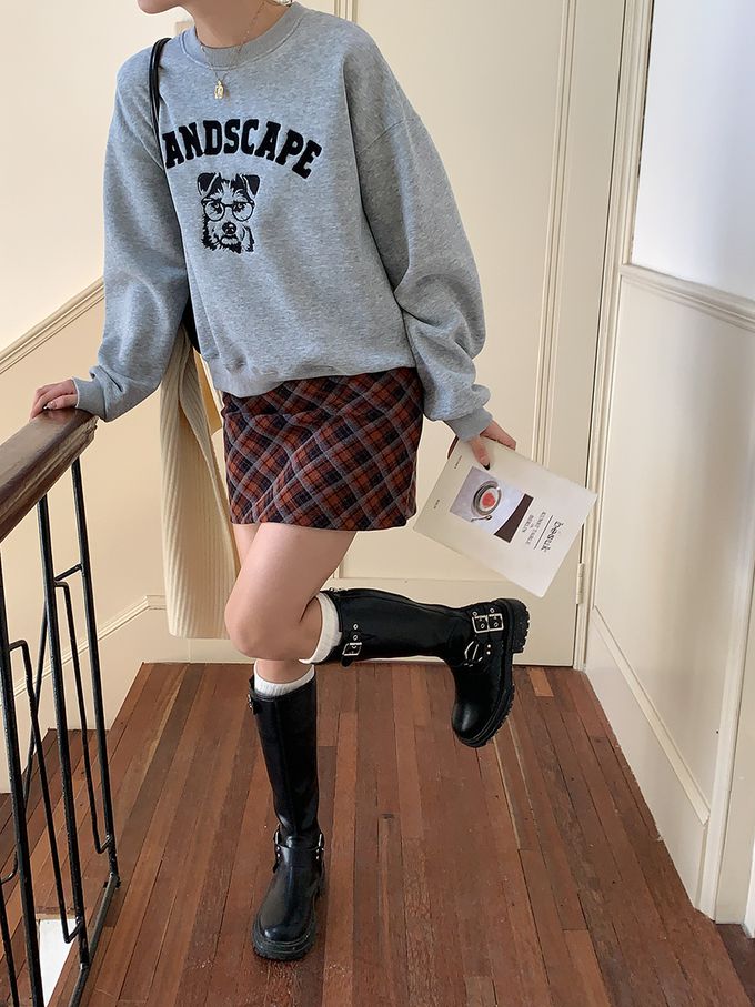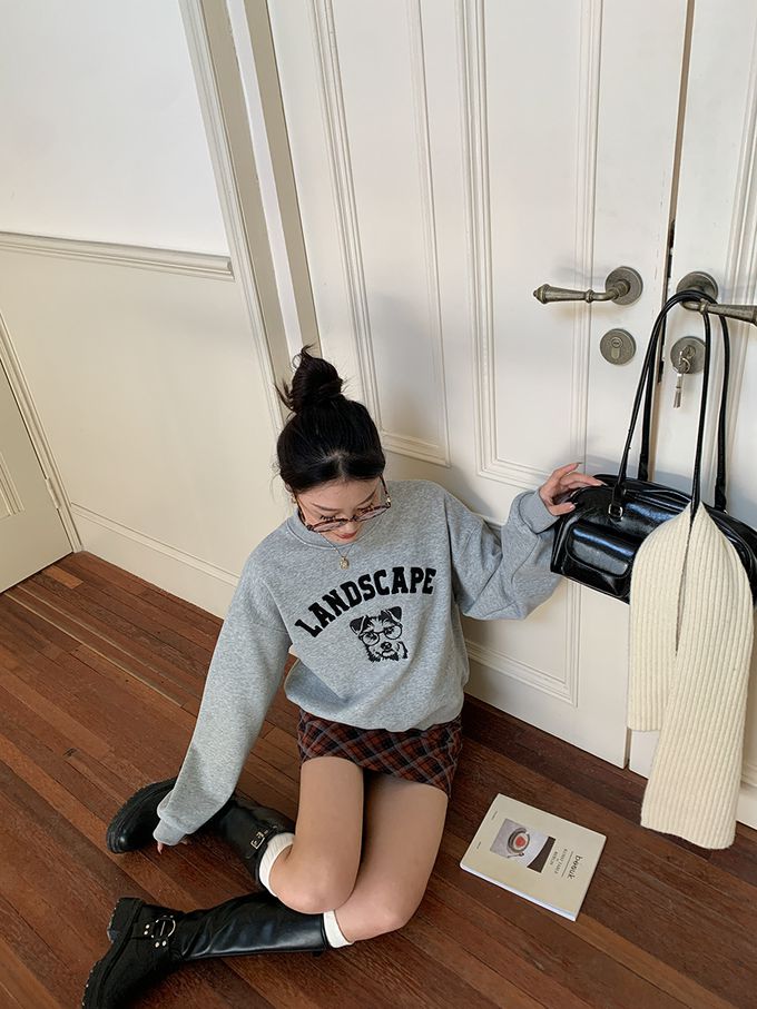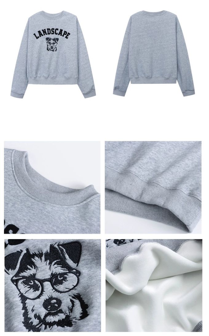 加絨款圓領長袖上衣/大學T-眼鏡狗狗-灰色 (F)