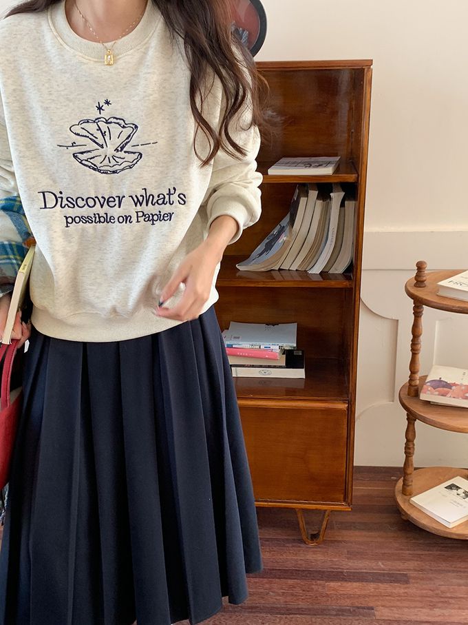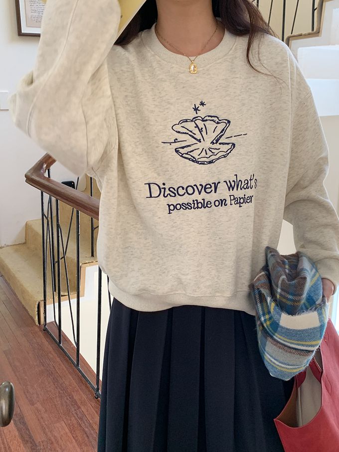 加絨款圓領長袖上衣/大學T-貝殼刺繡-麻白色 (F)
