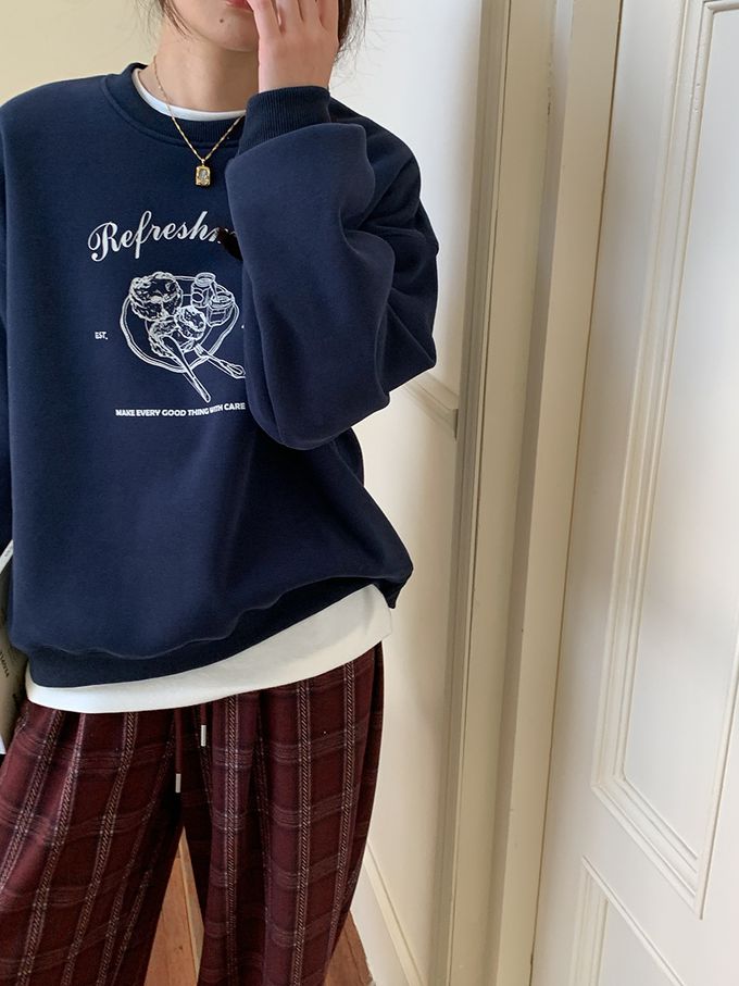 3th Morning - 加絨款圓領長袖上衣/大學T-時髦簡餐-藏青色 (F)