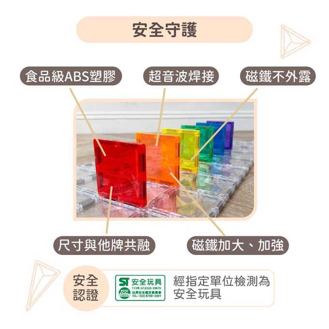 市面上的磁力片百百款,四寶媽在挑選上會特別在是否安全、開箱時有無異味,這款DUDUBAO磁力片有通過台灣ST安全玩具檢驗認證,並且使用超音波無卯丁的焊接方式,不擔心生鏽!孩子們能安心玩!