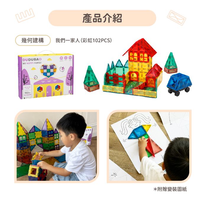 ★DUDUBAO磁力片在遊玩上能與其他磁力片品牌相容,色彩繽紛,可建構多樣化造型,激發孩子創作想像能力。