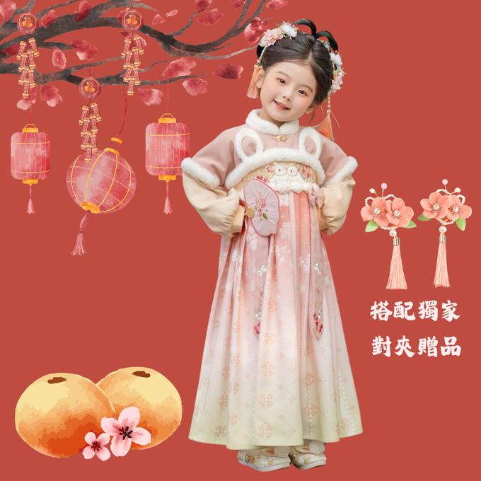 浪漫復古毛茸茸小兔耳蜜桃色拜年漢服洋裝