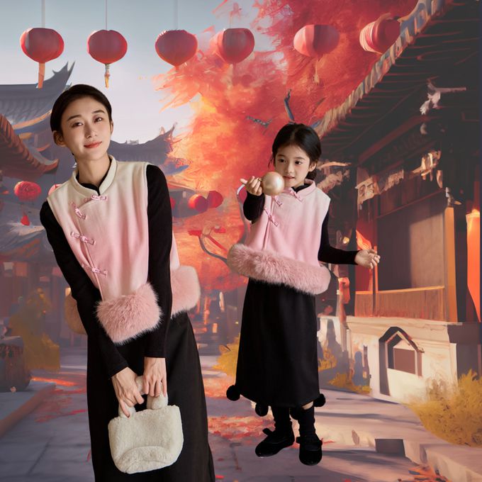 漸層粉紅仿羊絨旗袍領盤扣飾背心親子裝