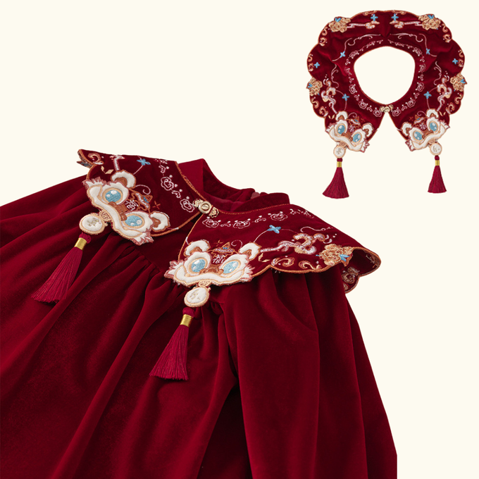 旗袍領祥龍刺繡領片紅色絲絨感洋裝(新年拜年服)