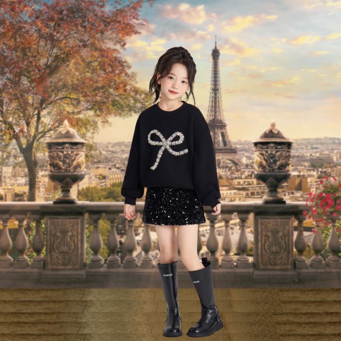 法式輕奢亮片蝴蝶結衛衣絲絨亮片短裙-衛衣+短裙-質感黑