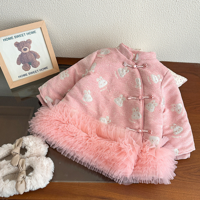 粉嫩色小兔子旗袍外套式洋裝網紗細摺花邊-外套式洋裝-粉紅色