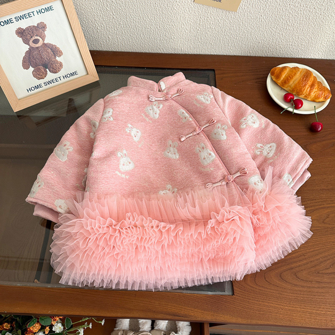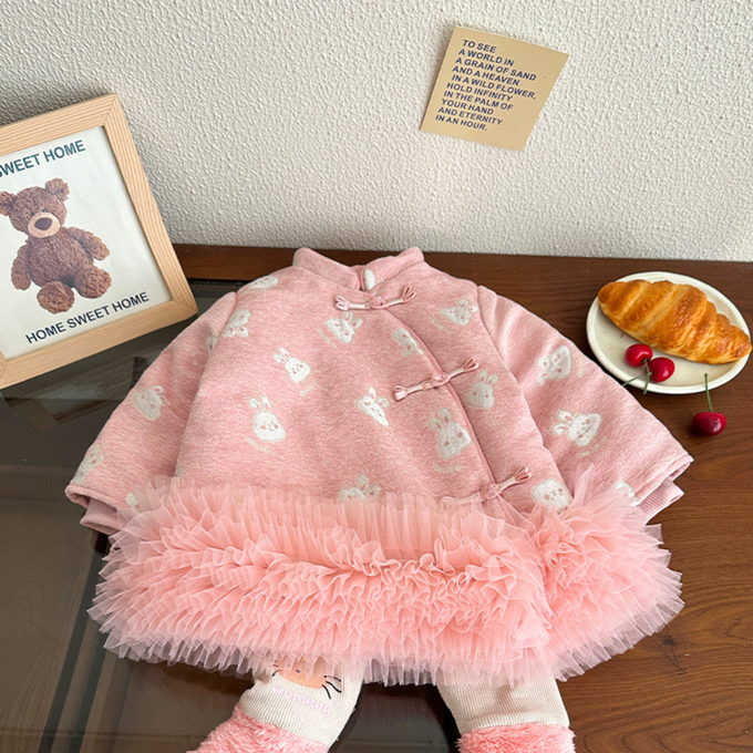 品名:粉嫩色小兔子旗袍外套式洋裝網紗細摺花邊