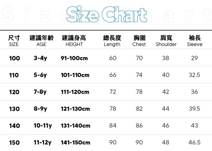 1. 尺寸表單位皆為公分(cm),實際尺寸會因布料彈性、水洗、測量起訖點等因素略有誤差。2. 平均尺寸表乃參考平均值制定,每位孩童成長速度略有不同,請參考孩子實際體型、現有衣物尺寸等實際測量結果進行選購。3. 第一次穿之前,建議單獨手洗。4. 建議以冷水洗滌,並遵循衣物上洗標指示,以免造成移染或掉色。5. 深淺色請分開洗滌,避免造成互相移染。請使用中性洗劑。浸泡時間不宜過長。6. 衣物若含圖案、印花等設計均建議手洗;如需機洗,請務必將衣服翻面放入洗衣網、再放洗衣機,以免刮損圖樣。(若有標註不可機洗或乾洗,請勿機洗、乾洗)7. 請勿使用漂白劑、螢光增白劑及衣物柔軟劑,以免破壞布料或導致掉色。8. 洗滌後立刻晾乾,勿使用烘衣機。過分烘乾可能會破壞織物纖維、導致衣物收縮。如有熨燙需求,請低溫熨燙。9. 每件商品於拍攝時均力求忠實呈現,但因每台電腦、手機或平板等設備之螢幕亮度、解析度不同,可能會有些許色差,謝謝媽咪爸比們的體諒。