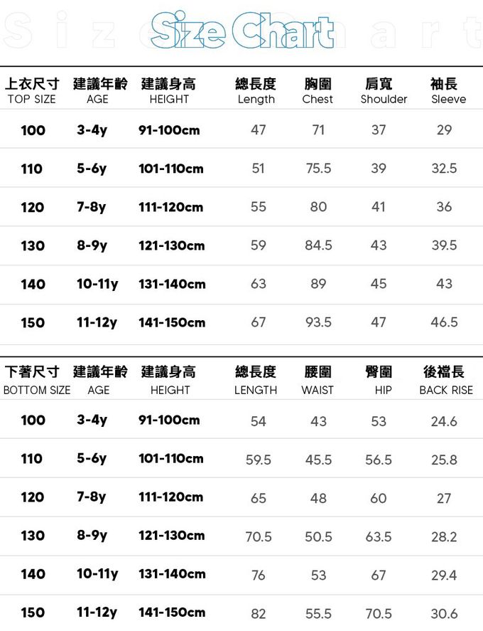 1. 尺寸表單位皆為公分(cm),實際尺寸會因布料彈性、水洗、測量起訖點等因素略有誤差。2. 平均尺寸表乃參考平均值制定,每位孩童成長速度略有不同,請參考孩子實際體型、現有衣物尺寸等實際測量結果進行選購。3. 第一次穿之前,建議單獨手洗。4. 建議以冷水洗滌,並遵循衣物上洗標指示,以免造成移染或掉色。5. 深淺色請分開洗滌,避免造成互相移染。請使用中性洗劑。浸泡時間不宜過長。6. 衣物若含圖案、印花等設計均建議手洗;如需機洗,請務必將衣服翻面放入洗衣網、再放洗衣機,以免刮損圖樣。(若有標註不可機洗或乾洗,請勿機洗、乾洗)7. 請勿使用漂白劑、螢光增白劑及衣物柔軟劑,以免破壞布料或導致掉色。8. 洗滌後立刻晾乾,勿使用烘衣機。過分烘乾可能會破壞織物纖維、導致衣物收縮。如有熨燙需求,請低溫熨燙。9. 每件商品於拍攝時均力求忠實呈現,但因每台電腦、手機或平板等設備之螢幕亮度、解析度不同,可能會有些許色差,謝謝媽咪爸比們的體諒。