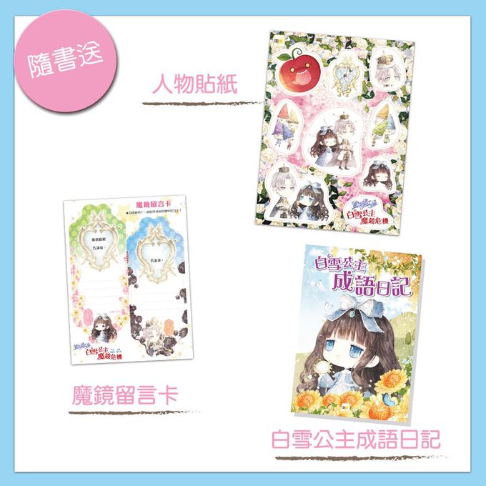 此外,除了《成語日記》,還配合書中的主題,另外搭贈了兩樣贈品:《人物貼紙》與趣味小禮卡《魔鏡留言卡》,希望小讀者在閱讀跟學習之外,能從中獲得更多樂趣。