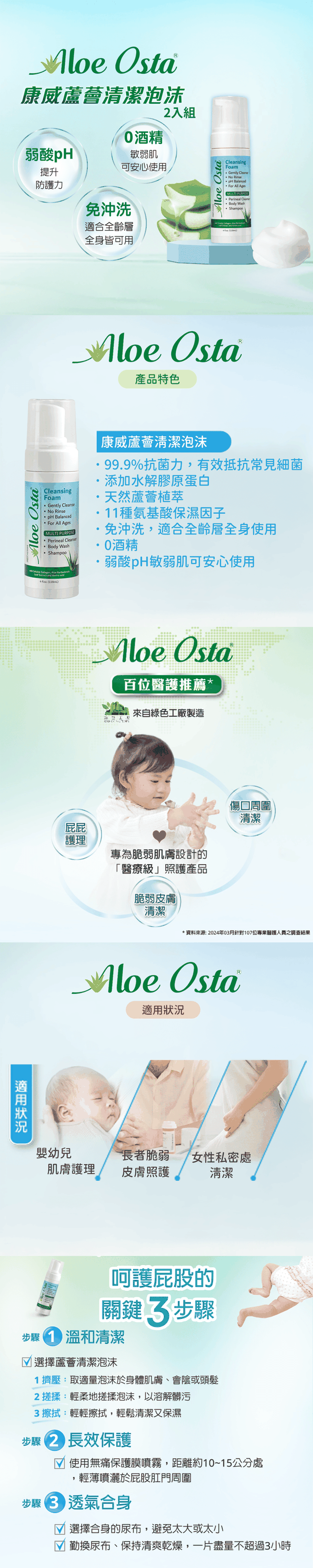 Aloe Osta康威蘆薈清潔泡沫有99.9%抗菌力,最棒的特點在於無需水洗,清潔上很方便!而且不分年齡層及全身肌膚均可以適用,溫和不刺激!將弱酸性的泡沫擠在有需要清潔的皮膚位置例如私密處或是當乾洗手、乾洗頭使用,泡沫塗抹在肌膚後拿乾紙巾用手畫圈的方式清潔至泡沫完全消失即可!