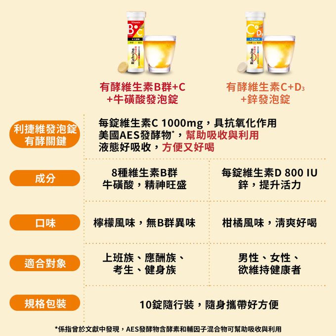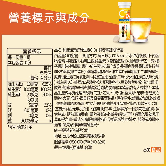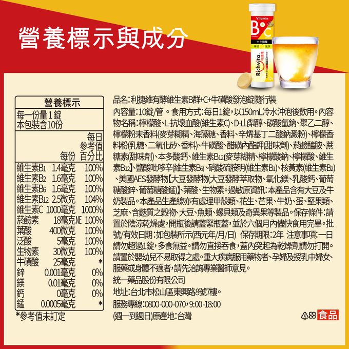 食品添加物:檸檬酸、L-抗壞血酸(維生素C)、碳酸氫鈉、D-山梨醇、聚乙二醇、檸檬粉末香料(麥芽糊精、海藻糖、香料、辛烯基丁二酸鈉澱粉)、檸檬香料粉(乳糖、二氧化矽、香料)、牛磺酸、醋磺內酯鉀(甜味劑)、菸鹼醯胺、蔗糖素(甜味劑)、本多酸鈣、維生素B12 0.1%【麥芽糊精、檸檬酸鈉、檸檬酸、維生素B12( 0.1%)】、鹽酸吡哆辛(維生素B6)、硝酸硫胺明(維生素B1)、核黃素(維生素B2)、美國專利AES發酵物【大豆發酵物(大豆發酵萃取物、氧化鎂、乳酸鈣、葡萄糖酸鋅、葡萄糖酸錳) 】、葉酸、生物素