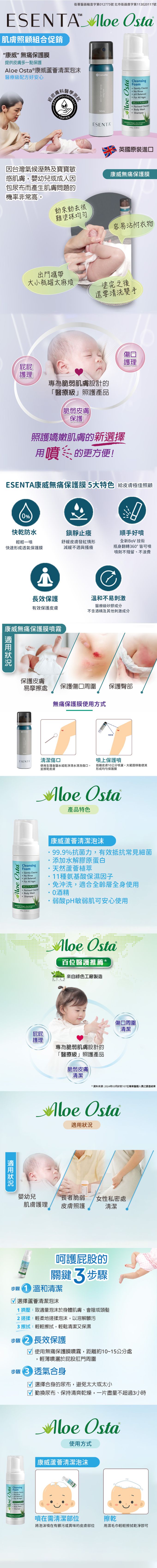 Aloe Osta康威蘆薈清潔泡沫有99.9%抗菌力,最棒的特點在於無需水洗,清潔上很方便!而且不分年齡層及全身肌膚均可以適用,溫和不刺激!將弱酸性的泡沫擠在有需要清潔的皮膚位置例如私密處或是當乾洗手、乾洗頭使用,泡沫塗抹在肌膚後拿乾紙巾用手畫圈的方式清潔至泡沫完全消失即可!