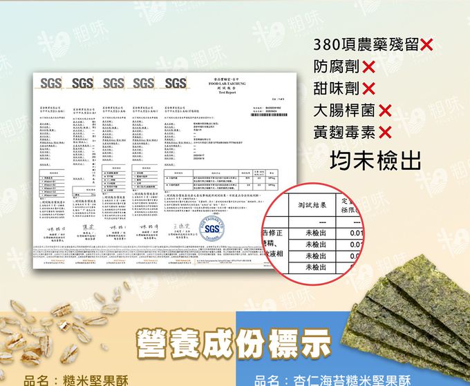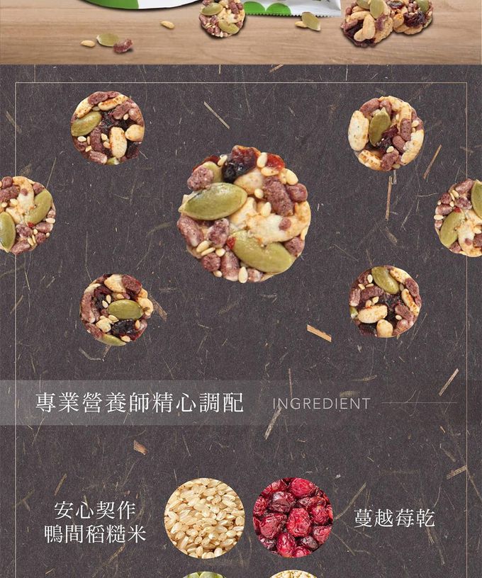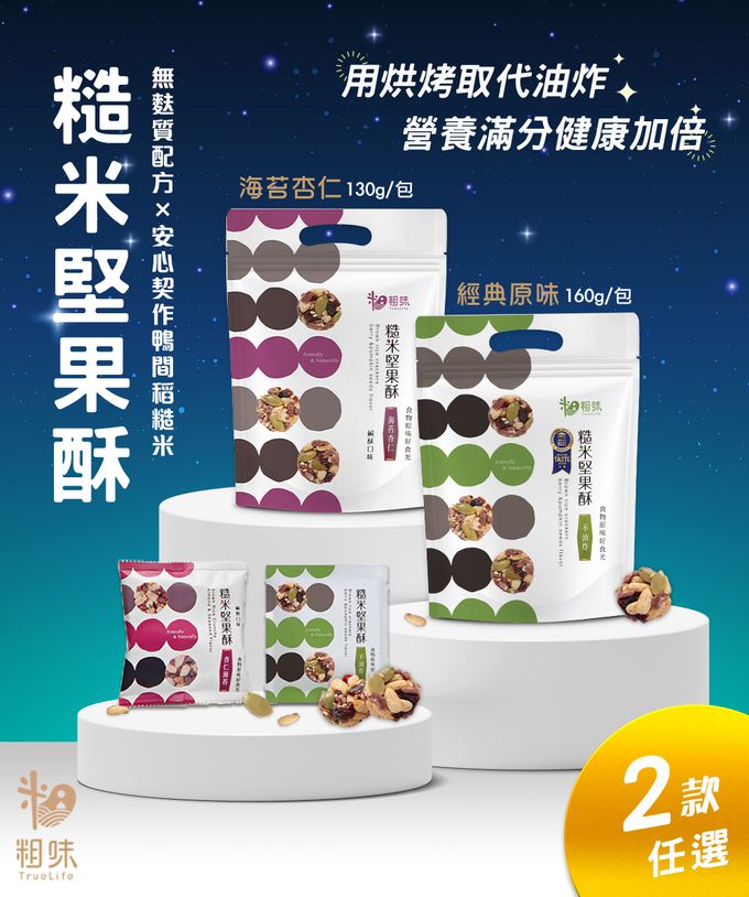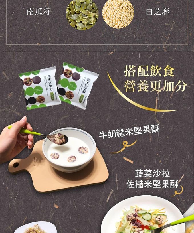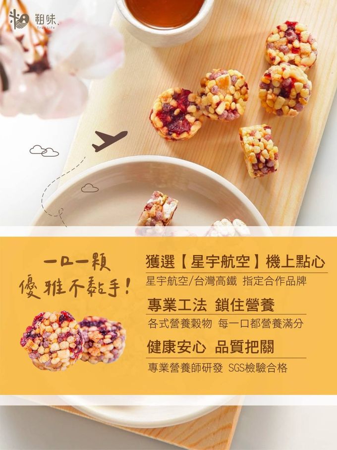 由營養師師特別調配,使用安心契作糙米與紫米. 提供每日身體所需之纖維素及不飽和脂肪酸, 無添加防腐劑及化學香料,使用天然麥芽糖取代砂糖更健康,不油炸、無麩質