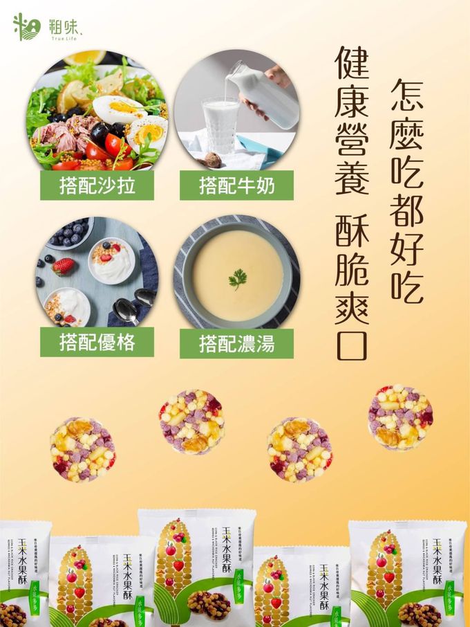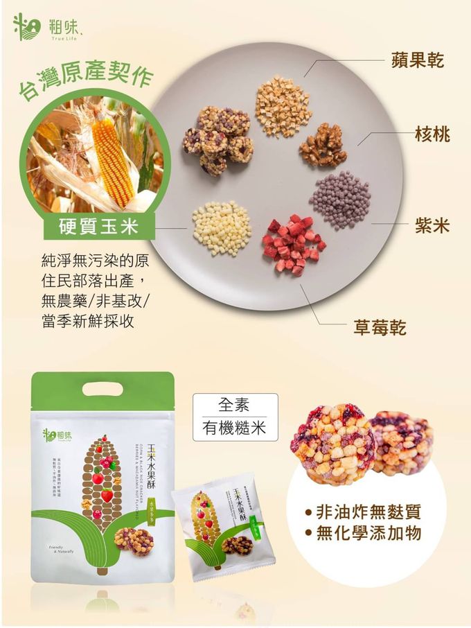 來自奇美部落的契作玉米,可搭配牛奶、豆漿、茶、咖啡.無添加防腐劑及化學香料,使用天然麥芽糖取代砂糖更健康,不油炸、無麩質