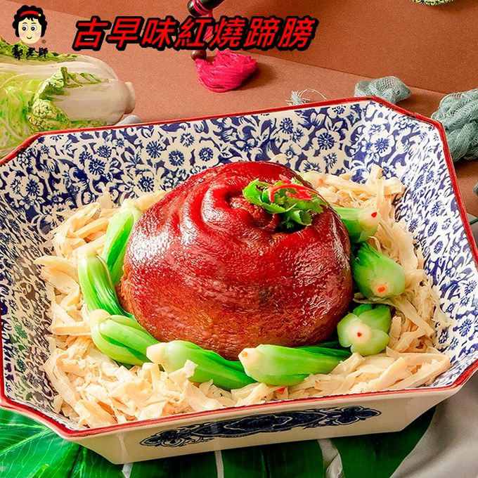 古早味紅燒蹄膀: 嚴選台灣在地豬蹄膀,選用一斤以上的大蹄膀,肥瘦比例佳,富有膠質,蹄膀經過川燙、油炸 ,加入冰糖、蠔油、紅麴以古法經過長時間的滷製,吃的到蹄膀滿滿Q彈的膠質,還有入口即化的腿庫肉。