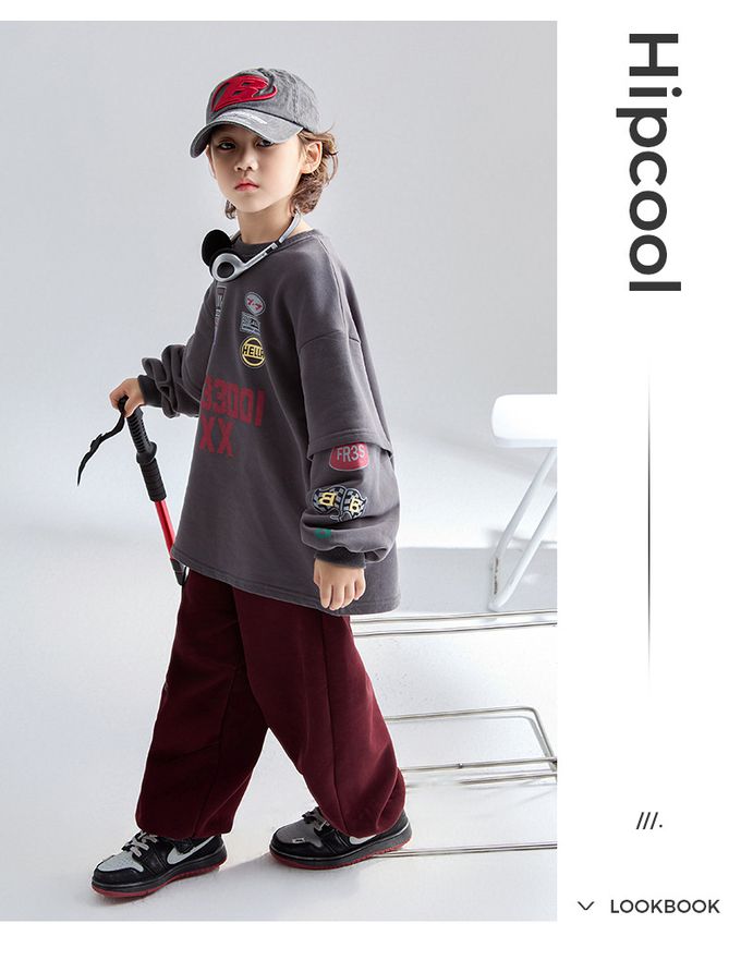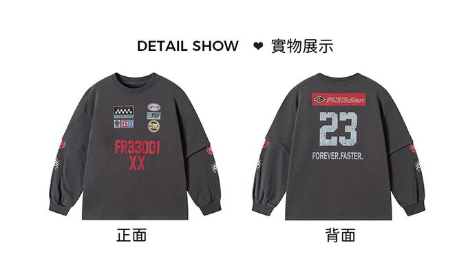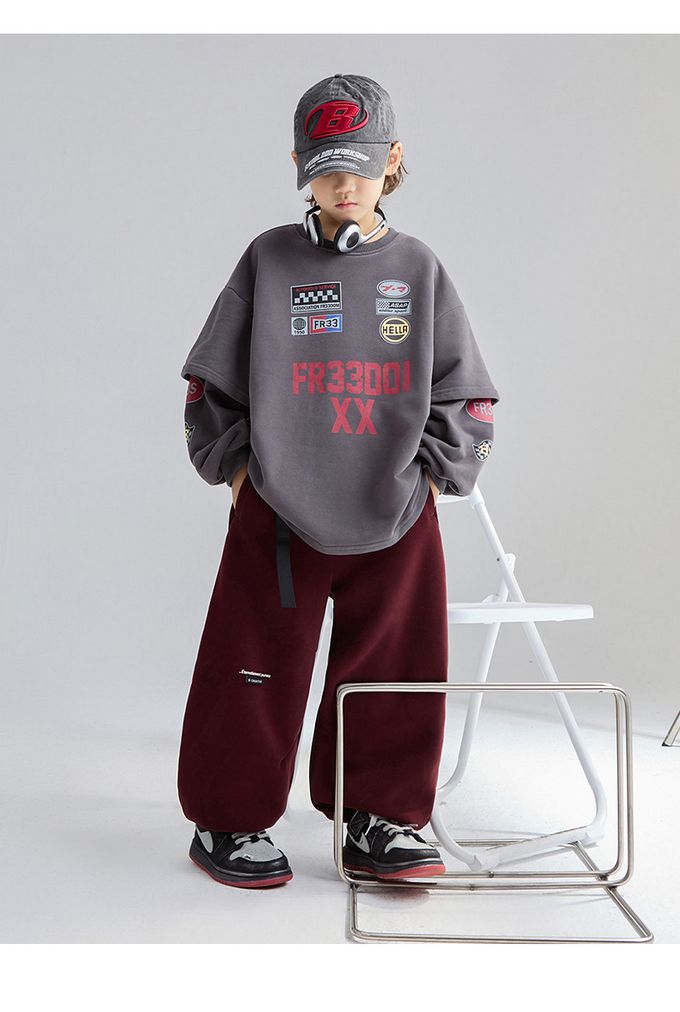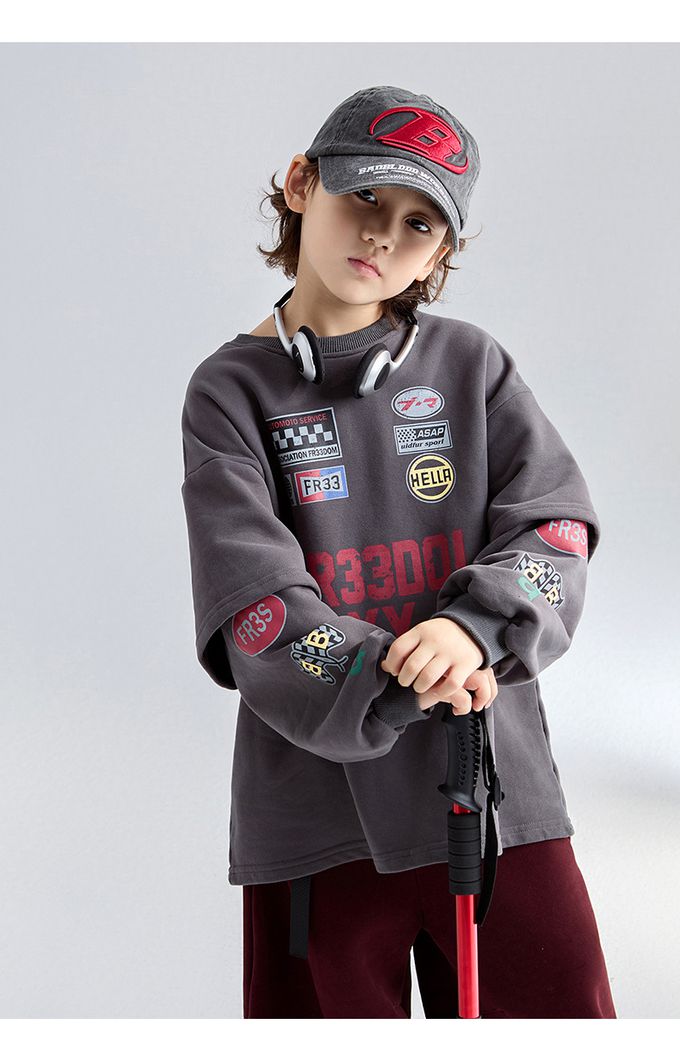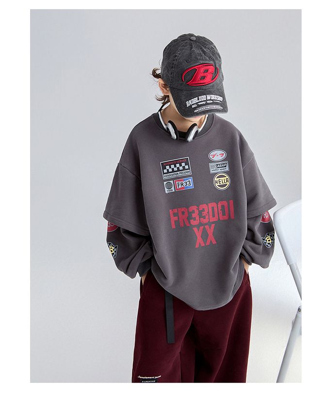 圓領假兩件寬鬆長袖上衣(加絨)-斑駁字母徽章-深灰