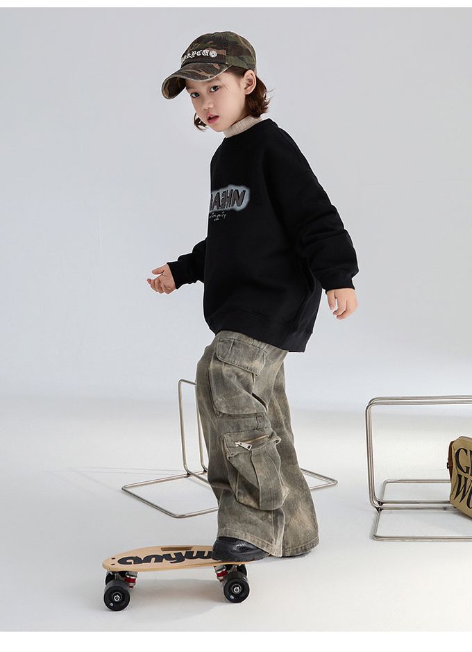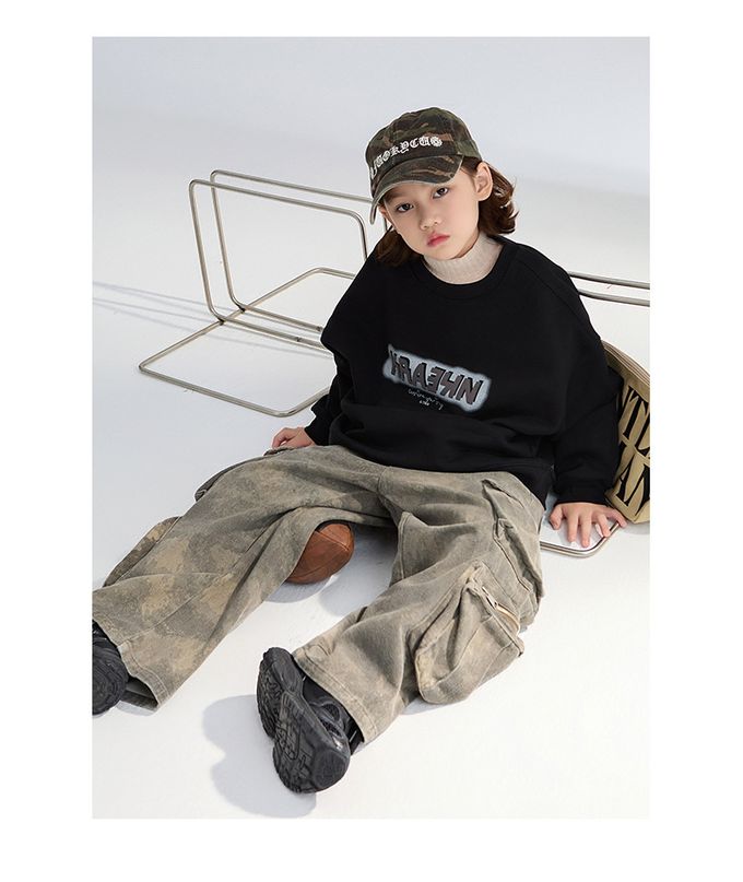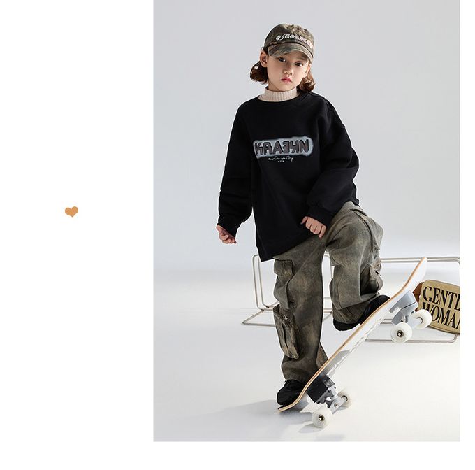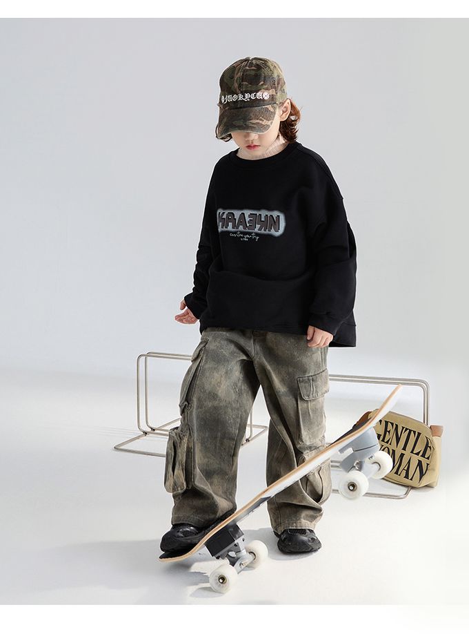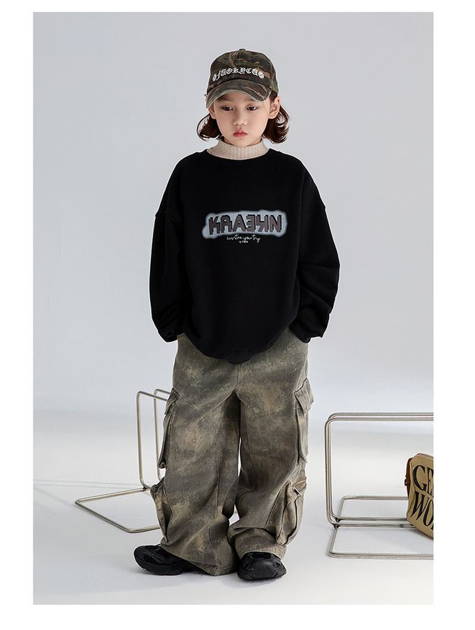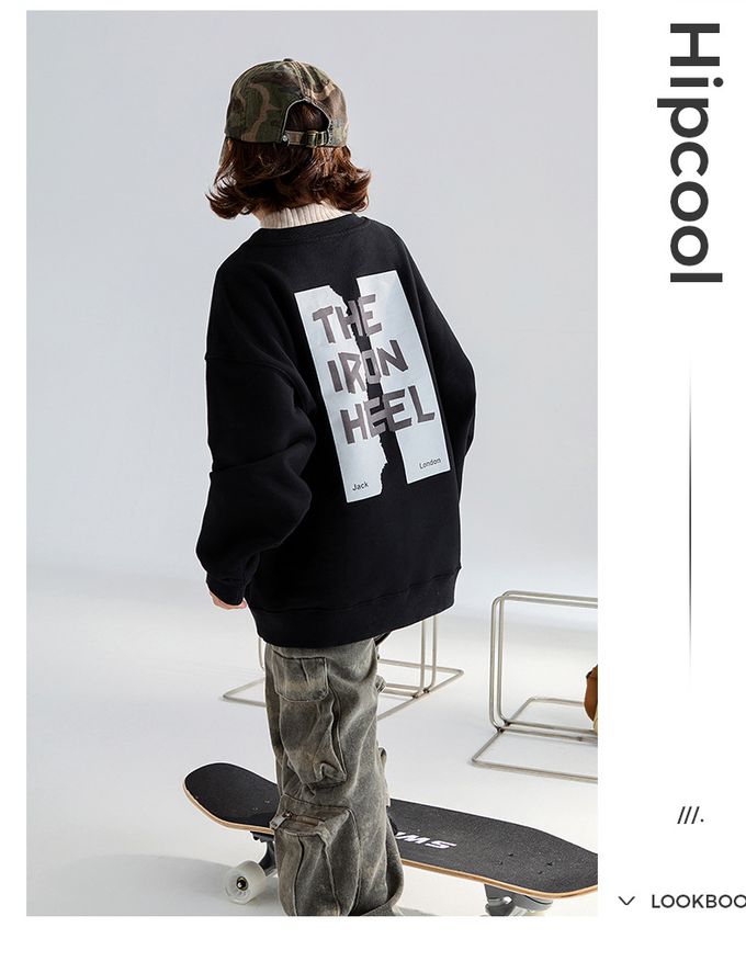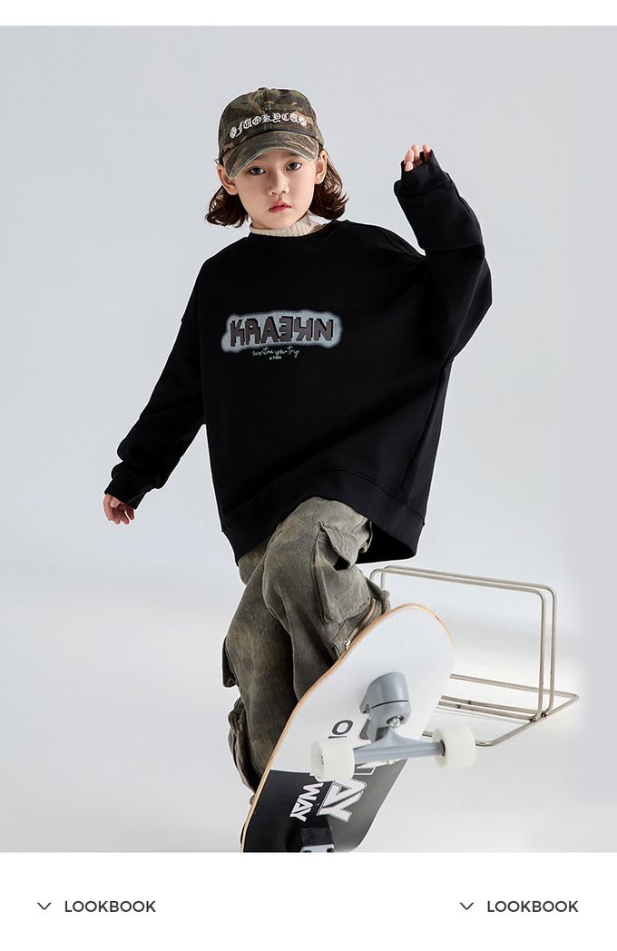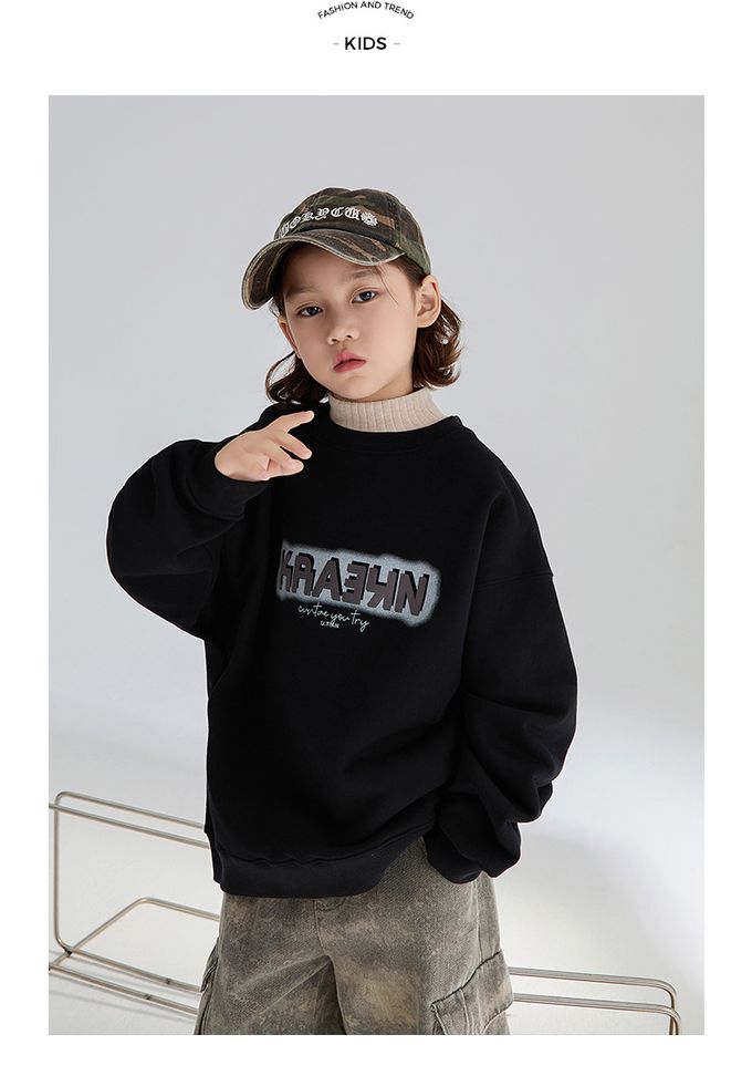 圓領寬鬆長袖上衣(加絨)-前後字母印花-黑色